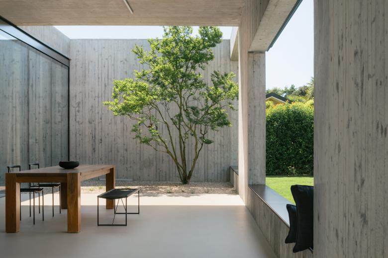 Il patio centrale, con copertura bucata in corrispondenza degli alberi di lagerstroemia e piante di graminacea, incornicia porzioni di cielo e lascia penetrare la luce naturale, amplificando la sensazione di apertura e continuità con l’esterno.