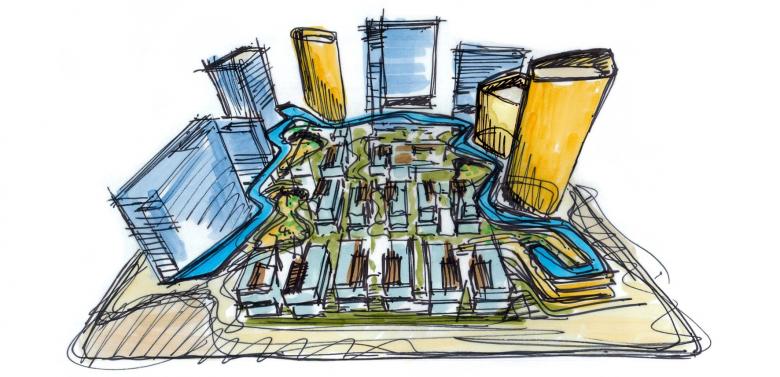 The canopy also mediates and blurs the higher towers surrounding the outer edges of the site and the lower garden-offices at the heart of the development. The two iconic gateway towers emerge out of the connecting canopy at the arrival plaza to the east and are slightly rotated against each other to form the main entry into the development. The central arrival area is between the gateway towers under the connecting canopy; and the position of the towers towards each other symbolises the collaboration of the two countries with each other. At the top of the towers the recessing roof terraces suggest constant dialogue between both countries, whilst the dynamic form of the towers represents the resulting synergy and collaboration between the two.