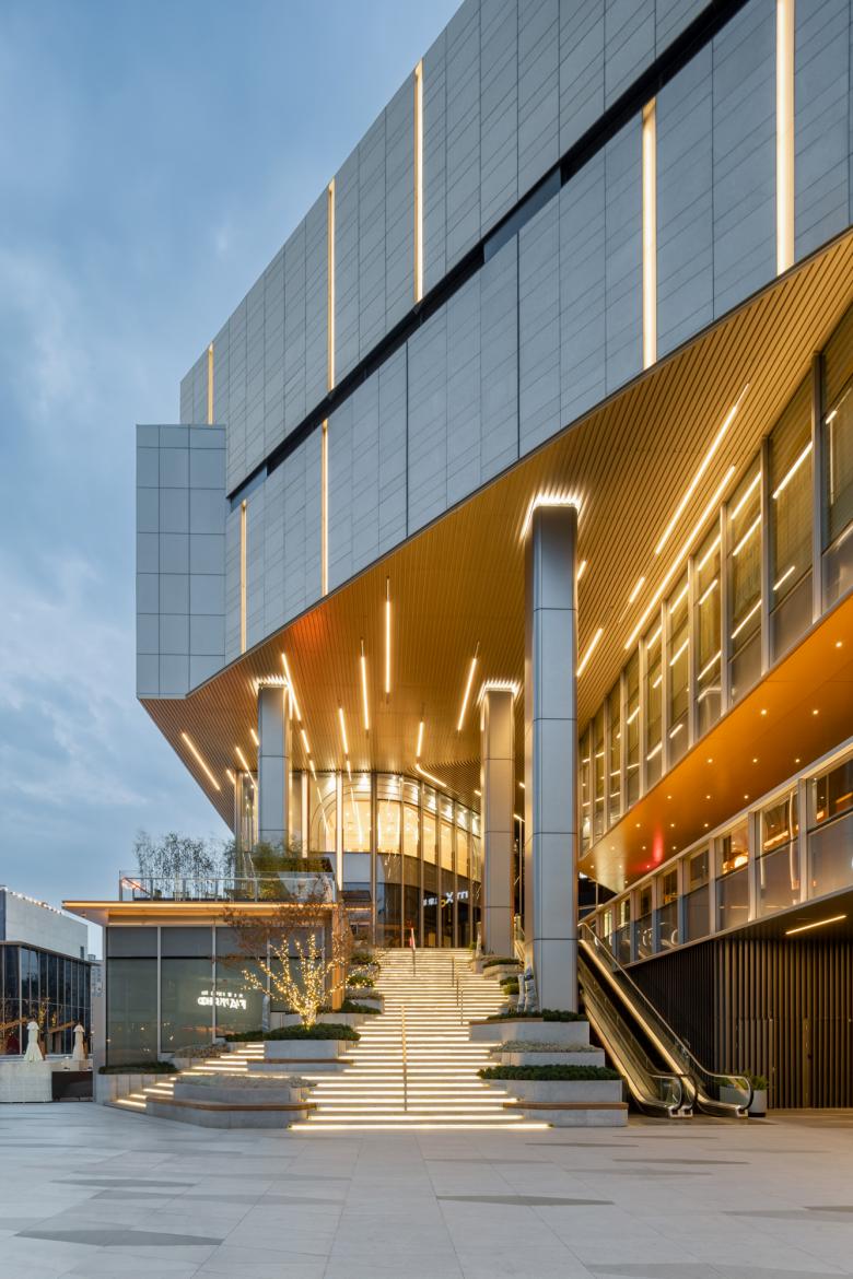 Drawing inspiration from Hangzhou's picturesque streams and mountains, the design seamlessly blends nature throughout the site. The podium's green terraces and open staircase evoke the image of gemstones nestled within rugged rock formations, while the glass boxes artfully juxtaposed against stone cladding add depth and contrast to the façade.