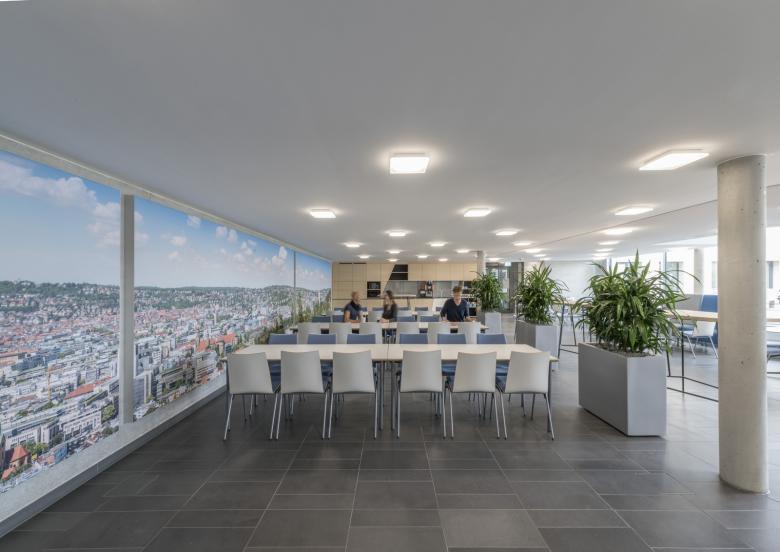 Die Bürgschaftsbank Baden-Württemberg liegt im Zentrum von Stuttgart und wird aus einem Ensemble von drei nebeneinanderliegenden Einzelgebäuden gebildet. Im Zuge der Erweiterung wurde das linke Bestandsgebäude durch einen Büroneubau mit Tiefgarage ersetzt. Dieser fügt sich mit seiner klaren und reduzierten Gestaltung stimmig in das städtebauliche Umfeld ein. Der Neubau wird ausschließlich als Bürogebäude genutzt und umfasst zusätzliche Büroflächen sowie eine Cafeteria. Im vierten Obergeschoss befindet sich ein Besprechungsraum mit vorgelagerter Terrasse und attraktivem Ausblick auf die Stadt. Ein eingeschossiger, zu beiden Seiten transparent gestalteter Gebäuderiegel dient als Eingangsbereich und verbindet Neubau und Bestand miteinander.