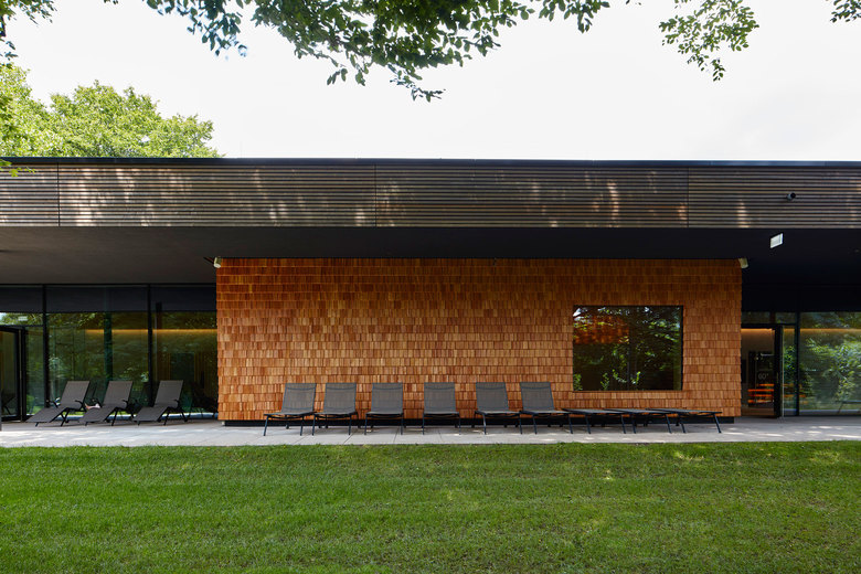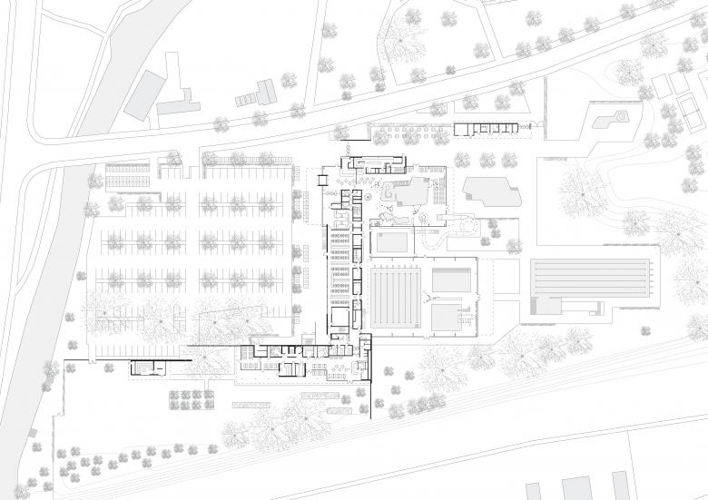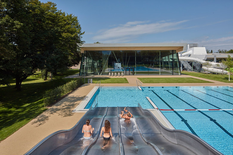 Inmitten der idyllischen Parklandschaft des Offenburger Bürgerparks befindet sich das neue Freizeitbad. Prägend für die Gestaltung des Gebäudes war das ausgewogene Zusammenspiel von Architektur und Landschaft: Weitläufige Dachflächen, großzügige Glasfassaden und atmosphärische Raumvolumen verzahnen sich mit der natürlichen Umgebung und bilden einen spannungsvollen Kontrast zwischen gebauter Umwelt und Landschaftsraum. Das Bad bildet im Westen des Grundstücks eine Schnittstelle zwischen Stadt und Park. So ist der zweigeschossige Eingangsbereich für Besucher, die zu Fuß über den Bürgerpark kommen, als Landmarke bereits weithin sichtbar.