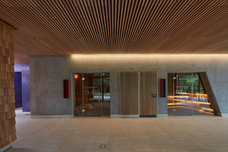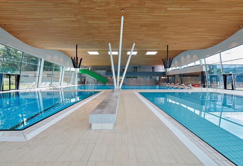 Architektonisch gliedert sich das Freizeitbad in drei Baukörper für die Bereiche Freizeit, Sport und Wellness. Diese lösen sich nach Osten hin auf und verzahnen sich über den Außenbereich behutsam mit der Parklandschaft. Weit auskragende Dachflächen, die sich mit großzügiger Geste in entgegengesetzter Richtung aufschwingen, prägen das Gebäude von außen. Über die transparent gestaltete, zweigeschossige Eingangshalle gelangen die Besucher in die Badehallen sowie den separaten Saunabereich und in den Sommermonaten in das Freibad. Die Badehallen sind in zwei Bereiche gegliedert: Im Nordosten das Freizeitbad mit direkter Anbindung an das Freibad und die Gastronomie und im Südosten das Sportbad. Die Trennung erfolgt über eine eingeschossige Badehalle für den Kursbereich. Blickfang in den zwei Badehallen ist eine geschwungene Holzlamellendecke, welche sich in sanfter Wellenbewegung zum Landschaftsraum hin anhebt. Der Saunabereich mit seinem großzügigen Saunagarten schließt das Gebäude im Süden ab. Eine Außensauna im weitläufigen Saunagarten bietet den Saunagästen einen besonderen Rückzugsraum mit Ausblick in die schöne Parklandschaft.