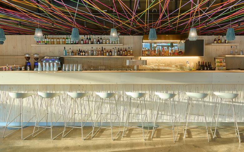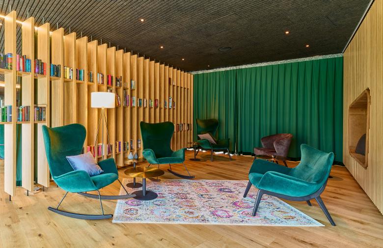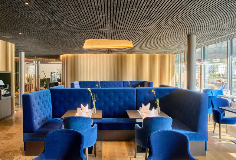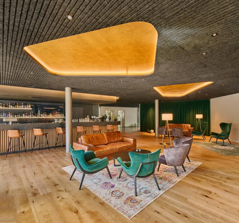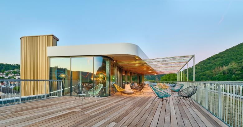Im Erdgeschoss befinden sich Foyer, Restaurant und Bar sowie die Seminarräume, letztere sind nach Süden ausgerichtet. Die Nebenräume hingegen liegen auf der Straßenseite und bilden einen schützenden Rücken zur Viktoriaallee. Hier verleihen großflächige Verglasungen sowie Vor- und Rücksprünge in der Fassadengestaltung dem Neubau ein lockeres und transparentes Erscheinungsbild im Stadtraum. Für maximale Aufenthaltsqualität sind auch sämtliche Zimmer auf allen vier Ebenen nach Süden orientiert, mit freiem Blick auf die Lahn. Das Dachgeschoss ist der Rooftop-Bar mit großem Außenbereich vorbehalten. Damit bietet das Thermenhotel seinen Gästen ein Ambiente zum Wohlfühlen und Entspannen – noch dazu steht dem Gast über einen Bademantelgang im ersten Stock das gesamte Bäder- und Wellnessprogramm der benachbarten Emser Therme zur Verfügung.