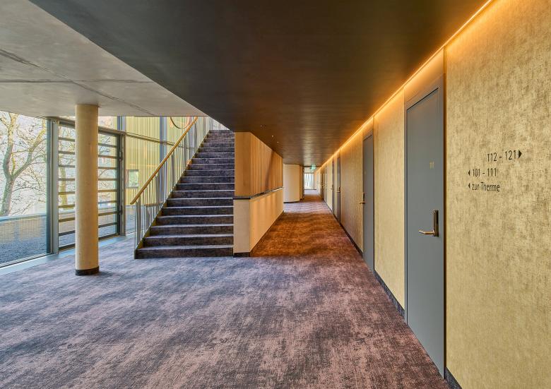 In unmittelbarer Nachbarschaft zur Emser Therme, die bereits 2012 von 4a Architekten geplant und errichtet wurde, entsteht ein neues Thermenhotel am Ufer der Lahn. Das 4-Sterne-Hotel umfasst 84 Doppelzimmer, Seminarräume, ein Restaurant und als Highlight eine Rooftop-Bar im Dachgeschoss. Um dieses umfangreiche Raumprogramm auf dem schmalen Baugrundstück entlang der Lahn zu realisieren, wurde ein viergeschossiger, langgestreckter Baukörper entwickelt, der sich behutsam in die Landschaft einbettet und in Form und Materialität Gestaltungselemente der Emser Therme aufgreift.