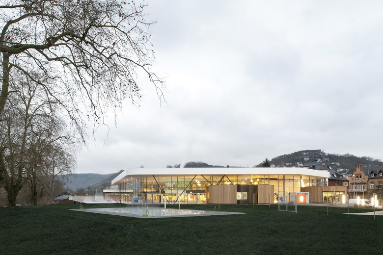 Ein wiederkehrendes Thema bei der Gestaltung der Therme ist der Flusskiesel, wie er auch am Ufer der Lahn vorzufinden ist. Dieser zeigt sich in der Formgebung der einzelnen Baukörper, der Schwimmbecken sowie bei den Fassadenöffnungen und auch bei der Wandgestaltung im Innenraum. Darüber hinaus greift die Therme auch in ihrer Materialität die Charakteristik von Kieselsteinen auf. Die einzelnen Baukörper formen mit ihrem Volumen unterschiedliche Steine, die ähnlich wie Kieselsteine am Flussufer geschichtet sind und sich einander überlagern. Im Zentrum befindet sich die Badehalle – weiträumig und großzügig gestaltet bildet sie das größte Element. Der Saunatrakt schließt nach Westen an. Mit markanter Kieselform schieben sich die zwei Baukörper, welche Gastronomiebereich und Shop beherbergen, in das Gesamtvolumen der Badehalle. Ein besonderer Blickfang sind die kieselförmigen Ausschnitte in der Nordfassade. Die asymmetrischen Öffnungen verleihen dem Baukörper auf der innerstädtisch zugewandten Seite ein lebendiges und heiteres Erscheinungsbild.