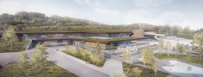 Neubau eines Freizeitbades mit Hallen- und Freibad in Hanglage: Besonderes Gestaltungsmerkmal für das neue Kombibad ist die behutsame Einbettung des Gebäudes in den Landschaftsraum. Das Bad entwickelt sich aus der Topographie des Hirschbachtals heraus und wird zu einem Teil der Landschaft. Die Geschosse und Dachflächen fließen als begrünte Ebenen mit Terrassen und Einschnitten aus dem Hang heraus und bilden ein zurückhaltendes Gegenüber zu den Terrassenhäusern im Norden des Grundstücks.