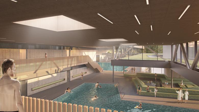 Die Erschließung erfolgt über einem Vorplatz in unmittelbarer Nähe zu den Parkflächen. Während die Umkleiden und die Technik zweigeschossig in den Hang eingeschoben werden, sind die Badehallen weitestgehend zum Tal hin ausgerichtet. Unmittelbar an den Eingangsbereich schließt der teils zweigeschossige Erlebnisbereich mit Galerie an. Liegeflächen, Kinderplanschbecken, das gläserne Dampfbad und die Gastronomie mit Aufenthaltsflächen befinden sich im eingeschossigen Bereich. Das Sportbad ist im Bereich der Sprunganlagen zweigeschossig ausgebildet. Unmittelbar davor liegen im eingeschossigen Bereich das Lehrschwimmbecken sowie der abtrennbare Kursbereich. Durch Fugen zwischen den terrassierten Dächern werden auch die im Hang liegenden Bereiche mit Tageslicht versorgt.