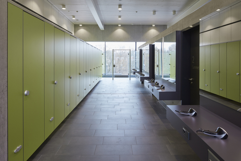 Die funktionale Ausrichtung des Hallenbades Riedlingen - es wird in erster Linie von Schulen und Vereinen genutzt - spiegelt die klare und kompakte Gestaltung des Baukörpers. Behutsam in den Hang einbettet, liegt das Hallenbad am Ortsrand der Stadt Riedlingen, in direkter Nachbarschaft zum Schulcampus mit Realschule und Gymnasium. Eine Außentreppe führt den Besucher vom Parkplatz nach oben zum Haupteingang. Vom Eingangsbereich im Erdgeschoss geben großzügige, raumhohe Glasfassaden den Blick in die Schwimmhalle frei und schaffen einen Dialog zwischen Innen- und Außenraum. Das Erdgeschoss ist klar organisiert und umfasst vier Zonen: Foyer, Umkleiden, Sanitärspange und Schwimmhalle. Ihren lichtdurchfluteten und weitläufigen Charakter erhält die Badehalle durch ihre nahezu dreiseitig raumhohe Verglasung. Von außen bildet das Erdgeschoss mit seiner einheitlich gestalteten Fassade einen markanten Baukörper. Durch den Materialwechsel zum Untergeschoss und den auskragenden Barfußgangs erhält das Erdgeschoss einen schwebenden Charakter.