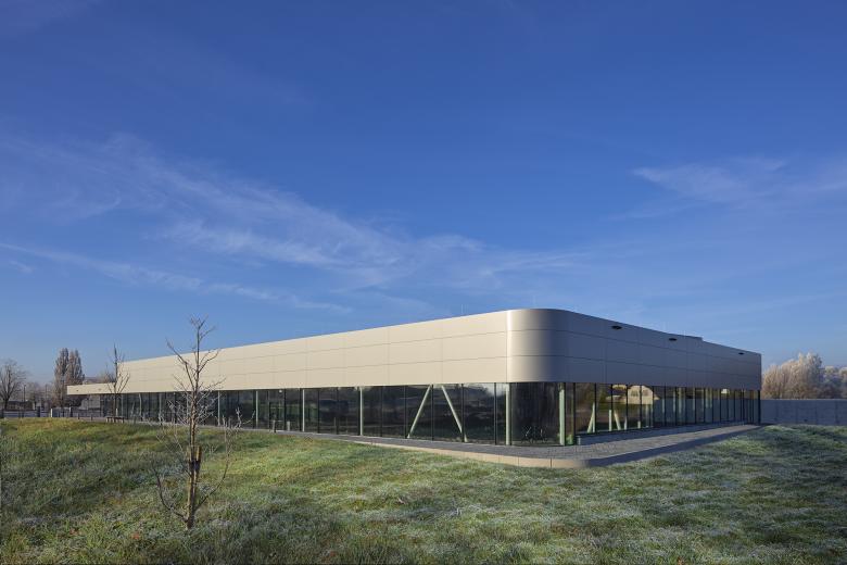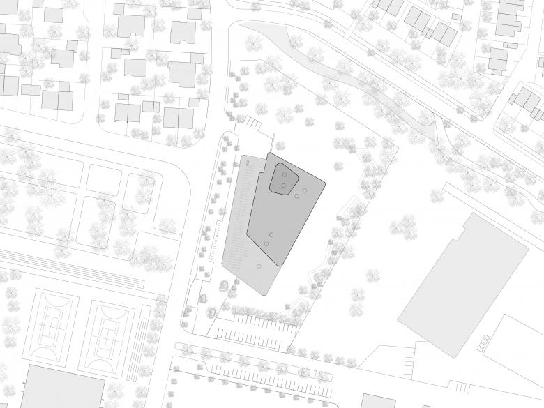 Ein Mix aus klarer Formensprache und starken Kontrasten prägt das Hallenbad in Neutraubling. Von außen ist das Gebäude ruhig und geschmeidig gestaltet und gliedert sich in zwei flächige Volumen. Diese unterscheiden sich zum einen in ihrer Nutzung, zum anderen in der Raumhöhe. Der niedrige Baukörper nimmt Foyer und Umkleiden auf, die Badehalle ist den Anforderungen entsprechend höher gestaltet. Ein großzügiger Vorplatz markiert den Eingangsbereich und leitet die Besucher ins Gebäude. Parallel zur Straße angeordnet, bildet der Umkleideriegel einen schützenden Rücken zum gegenüberliegenden Friedhof und den Wohngebieten im Westen. Foyer und Umkleidetrakt schieben sich mit reduzierter Höhe in die unmittelbar anschließende, weiträumige Badehalle. Diese öffnet sich mit Sport-, Freizeit- und Wellnessbereich sowie Gastronomie großflächig nach Süden bzw. Südosten zum Außenraum.