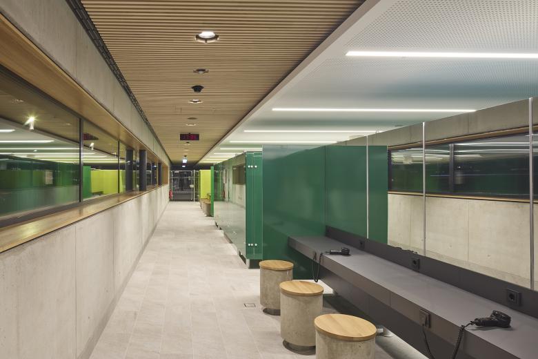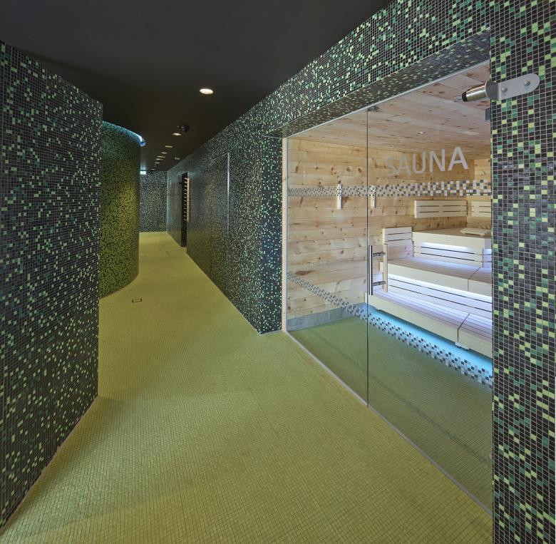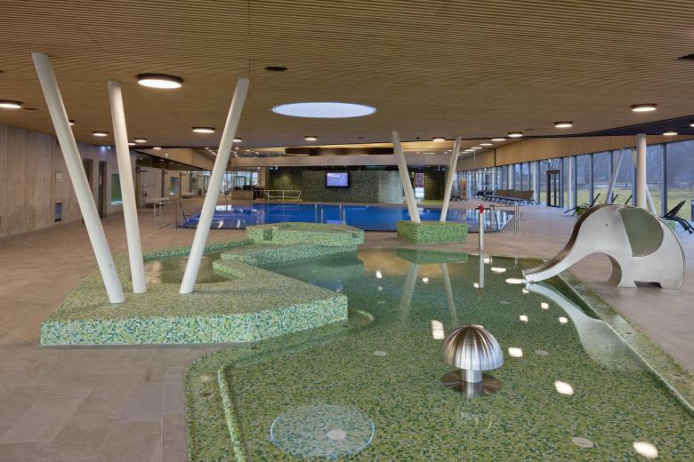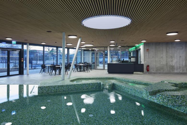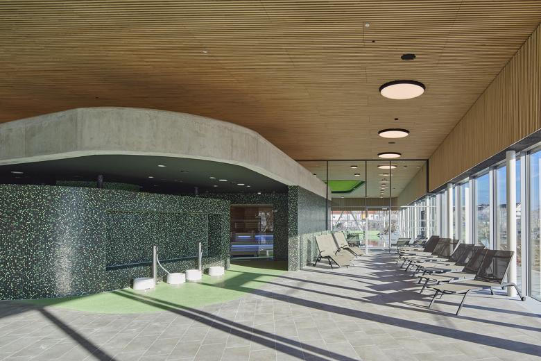 Im Zentrum des Gebäudes, zwischen Freizeit- und Sportbereich, befindet sich die Wellnesszone mit Dampfbädern, Erlebnisduschen und Ruheflächen. Verglaste Wände zwischen den unterschiedlichen Zonen ermöglichen eine gute Orientierung und erhalten das weitläufige Raumgefühl in der Badehalle. Im Innenraum verleihen freundliche, naturbelassene und robuste Materialien, die dauerhaft und pflegeleicht sind, dem neuen Hallenbad eine hohe Aufenthaltsqualität und Wohlfühlatmosphäre.