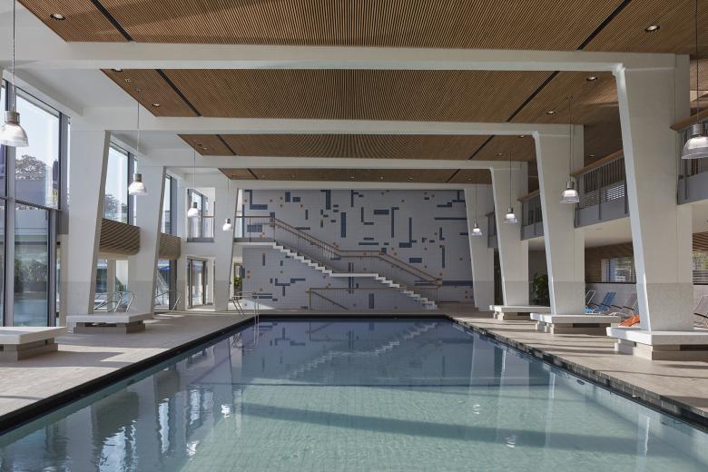Das Mineralbad Berg liegt mitten im Stadtraum von Stuttgart, umgeben von einer großzügigen Parklandschaft mit altem Baumbestand. Im Fokus der Sanierung des ältesten Stuttgarter Mineralbades stand, die richtige Balance zwischen Erhalt, Erneuerung und Ergänzung zu finden, um den besonderen Charme zu wahren und die Neugestaltung in Anlehnung an die 50er-Jahre zeitgemäß zu interpretieren. Der L-förmige Baukörper mit Nord- und Ostflügel, in den das quadratische Außenbecken mit Seecharakter eingebettet liegt, blieb in seiner ursprünglichen Form erhalten und wurde bis auf den Rohbau zurückgeführt. Lediglich das alte Bewegungsbad im Osten der Anlage wurde abgerissen und durch einen Anbau an die Badehalle ersetzt. Die neu gestaltete Eingangsfront mit blau schimmernder Mosaikfassade und frei gelegtem Kolonnadengang verleiht dem Bad eine neue Identität im Stadtraum. Großflächige Verglasungen geben bereits von außen den Blick auf das Außenbecken und den Garten frei und erzeugen im Innenraum eine lichtdurchflutete Atmosphäre. Das offen gestaltete Foyer mit Gastronomie fungiert als zentrale Schnittstelle im Bad. Kunstelemente aus dem Bestand wie die Ackermann-Glaskunst an der Decke und die vergoldete Badewanne auf der Galerie verleihen dem Foyer ein nostalgisches Flair. Die Badeebene mit Badehalle, Bewegungsbad und Außenbecken liegt nach wie vor im Erdgeschoss. Im Obergeschoss befinden sich die Saunabereiche mit Liegeflächen, die wie im Bestand für Damen und Herren voneinander getrennt sind sowie ein Gymnastikraum mit Ausblick in die Parkanlage. Eine Galerie im Obergeschoss erweitert die Badehalle um Liegeflächen. Gestaltgebendes und akustisches Element in den Badehallen ist eine neue Holzlamellendecke, die sich in sanftem Schwung von der Wandfläche über die Decke bis hin zur Glasfassade schwingt. Sie verleiht dem Innenraum eine warme Atmosphäre und sorgt für eine gute Akustik. Besonders charakteristisches Element in der Badehalle ist die grafisch gestaltete Fliesenwand, die in Zusammenarbeit mit dem Stuttgarter Künstler Prof. Matthias Kohlmann in Anlehnung an den Bestand entwickelt wurde. Insgesamt prägen das Mineralbad nur wenige Materialien wie Holz, Feinsteinzeug, Mosaikfliesen, Sichtbeton und Stahl und eine gedeckte Farbigkeit – für ein ruhiges und entspannendes Ambiente.