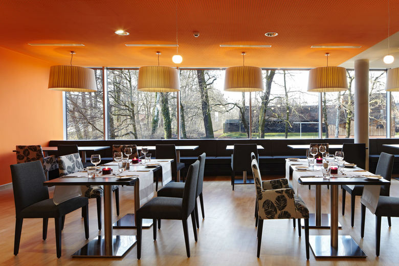 Natur, Wellness und Design: In unmittelbarer Nachbarschaft zur Spreewald Therme, die bereits 2005 von 4a Architekten geplant und errichtet wurde, bietet das 4-Sterne-Hotel seinen Gästen ein Ambiente zum Wohlfühlen und Entspannen. Die Besonderheit und Herausforderung lag darin, das Hotel in den Kontext der Therme zu stellen und zugleich dem neuen Gebäude individuellen und eigenständigen Charakter zu verleihen. Für die gestalterische Einheit von Hotel und Therme sorgen optimal aufeinander abgestimmte Materialien – wie auch das Sole-Thermalbad greift das Hoteldesign die wesentlichen Gestaltungselemente der Spreewald-Region auf. Ein Bademantelgang verbindet Hotel und Therme baulich miteinander. Eine weit auslaufende, mit Ziegeln verkleidete Wandscheibe definiert die Eingangssituation und schafft in ihrer Materialität eine Verbindung zur Spreewald Therme. Die drei oberen Geschosse bilden durch die anthrazitfarbene Fassadenverkleidung sowie die einheitlichen, großformatigen Öffnungen eine Einheit – hier sind die insgesamt 83 Zimmer mit 166 Betten untergebracht. Einen leicht schwebenden Charakter erhält der dreigeschossige Baukörper durch die transparente Gestaltung des Erdgeschosses mit größtenteils fassadenhohen Verglasungen.