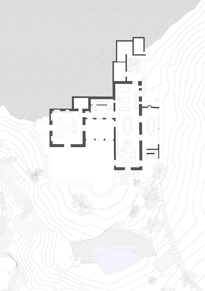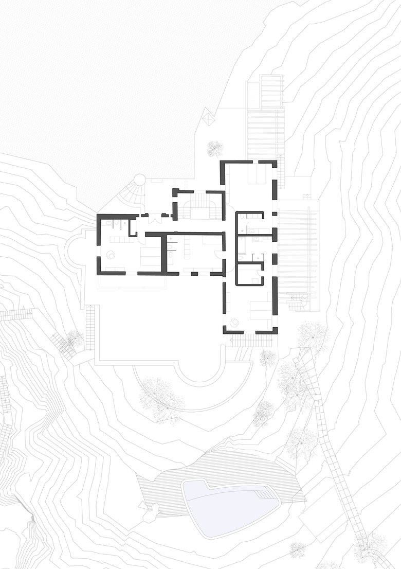 Im Untergeschoss befinden sich zwei weitere Gästezimmer. Darüber hinaus wurden im Zuge der Sanierung die Eingangshalle und das Treppenhaus umgebaut. Das exponiert auf einer Felsnase gelegene Schwimmbad erhielt eine neue Form und wurde ebenfalls modernisiert sowie die Außenanlagen neu gestaltet.