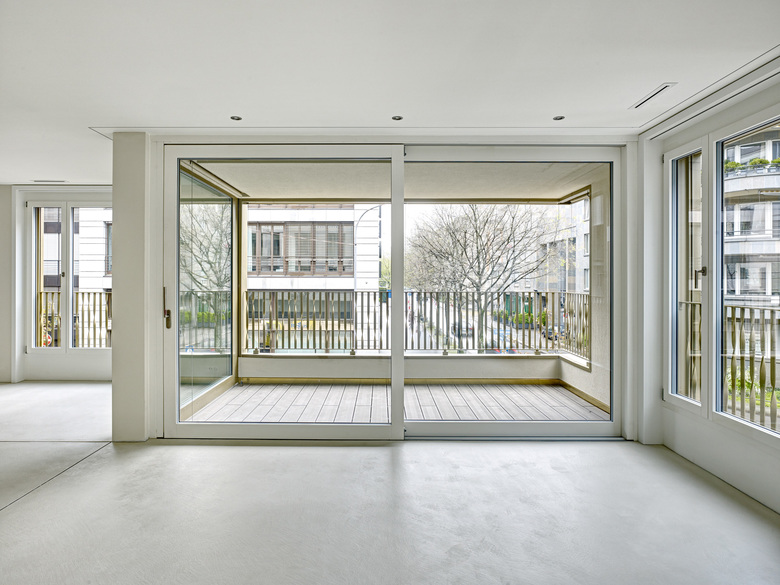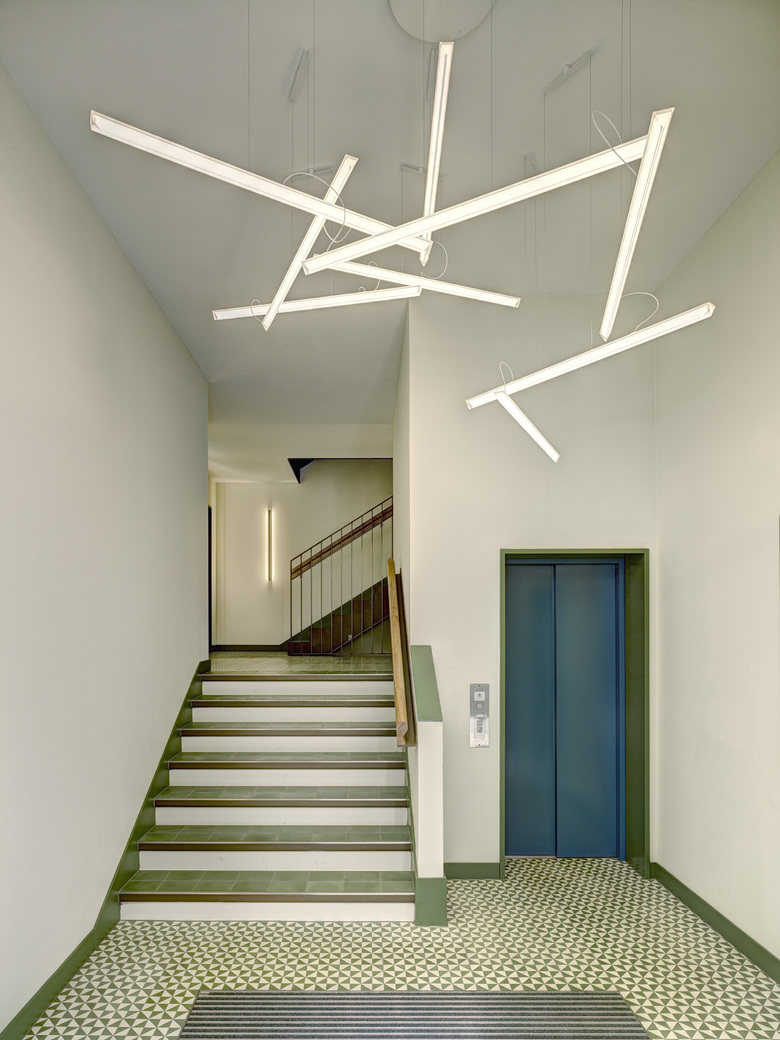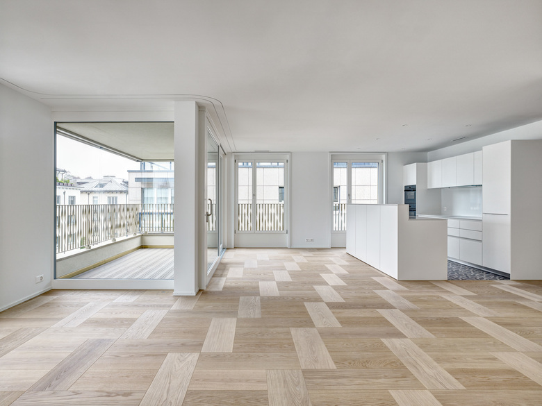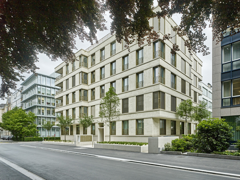 Das freistehende Mehrfamilienhaus in städtischer Zentrumslage wurde mit einem Hochparterre, vier Regelgeschossen und einem Attikageschoss erstellt. Um das zentrale Treppenhaus entwickeln sich pro Geschoss drei Wohnungen. Diese sind jeweils auf zwei Seiten orientiert und erhalten eine eingezogene Loggia an der Gebäudeecke. Der Wohnraum wird mithilfe eines vorspringenden Erkers erweitert. Die regelmässig angeordneten Fenster werden von horizontalen Bändern begleitet. Die horizontale Bänderung und die Lochfassade sind quartiertypische Gestaltungsmerkmale. Die einfach gehaltene Fassade erhält auf diese Weise eine dem Preissegment entsprechende edle Note. Das Hochparterre ergibt für das Erdgeschoss eine sehr gute Wohnqualität und ermöglicht durch die Mehrhöhe einen überhohen Hauszugang, welcher dem Haus einen gewisse Exklusivität verleiht. Die Grundrisse der Wohnungen erlauben unterschiedliche Anordnungen der Küchen, um verschiedene Käuferwünsche abdecken zu können.