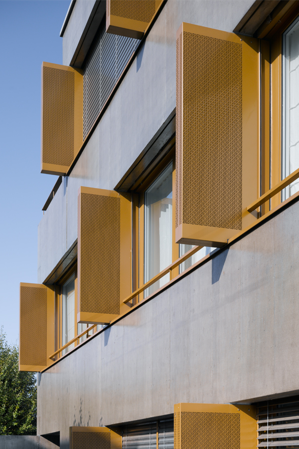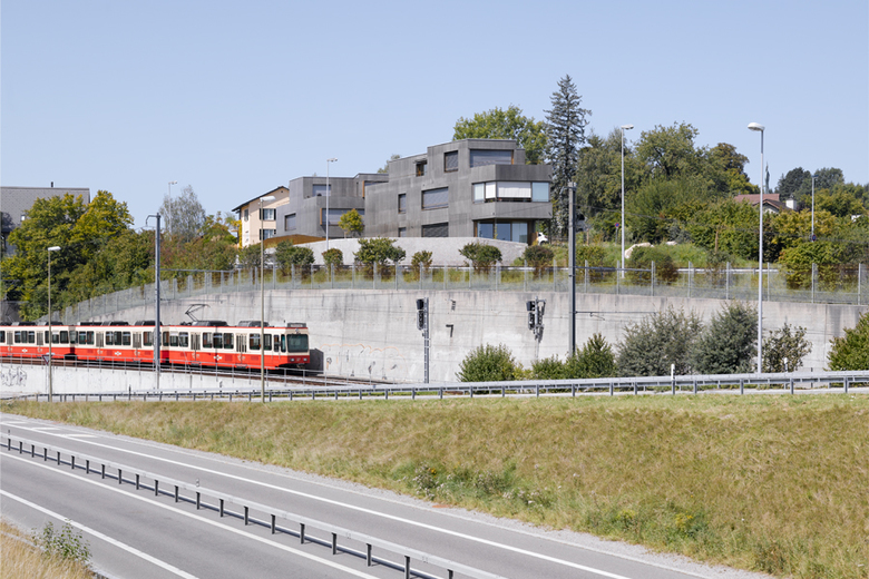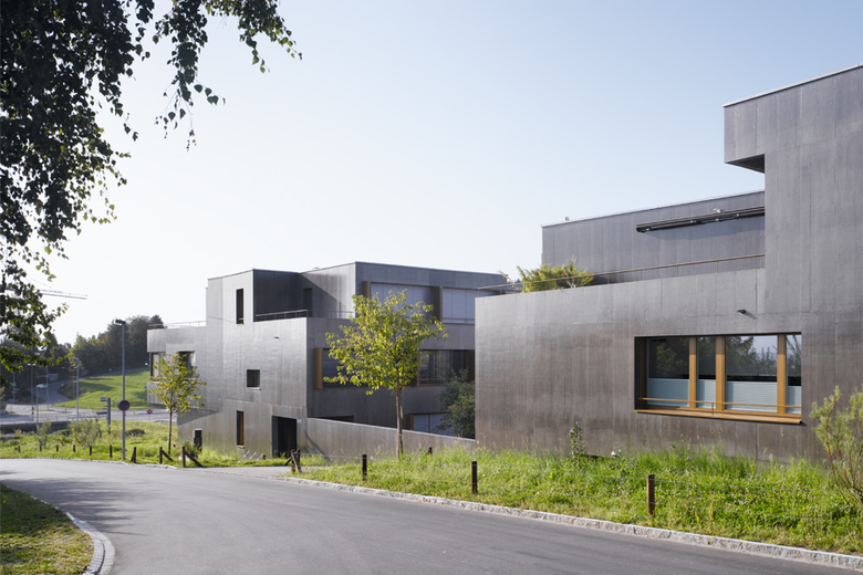 Bezugnehmend auf die unvergleichliche Aussichtslage an erhöhter, prominenter Position und die Lärmproblematik richten sich die Wohnungen auf das nördliche Greifenseegebiet, die südliche Landschaftskammer und die Alpen im Osten aus; gleichzeitig haben sie Anteil am ruhigen, identitätsstiftenden Hof. Der Hauptzugang, wo sich auch die Besucherparkplätze befinden, liegt am topographisch richtigen Ort und führt zur leicht vom Hofniveau abgesetzten Verbindung der Häuser Ost und West. Kleinwüchsige Bäume gliedern den Innenbereich. Die übrige Umgebung wird in lockerer Weise mit Bäumen besetzt. Ausser den zugeteilten Sitzplätzen vor den Wohnzimmern in den Erdgeschossen sind grundsätzlich alle Umgebungsbereiche allgemein zugänglich, die gegenseitige Rücksichtnahme der Bewohner kann vorausgesetzt werden.