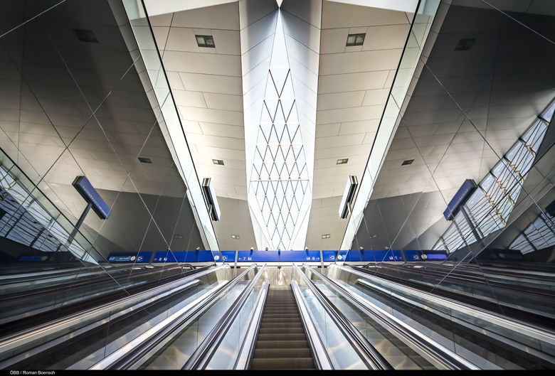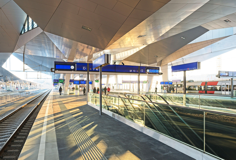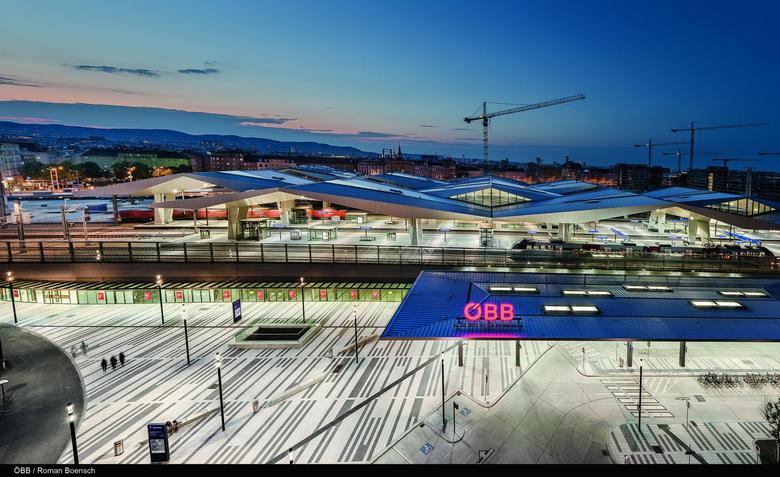 Das markante Dach der neuen Verkehrsstation repräsentiert mit ihrer harmonischen Gestalt, ihrem Rhythmus und Schweben die Welt- und Musikstadt Wien. Das Dach ist in fünf lange und jeweils bis zu fünf Mal geknickte Parallelbahnen aufgeteilt. Sie liegen auf schrägen, in 40 m-Abstand positionierten Doppelstützen-Stahlböcken. Die Länge eines Rautentisches beträgt 80m. Dort, wo eine Dachbahn nach oben geknickt ist, wurde die benachbarte nach unten gefaltet. Durch diese Versetzung entstehen rautenähnliche, verglaste Öffnungen zwischen „Wellenbergen“ (Firsten) und „Tälern“ (Traufen). In mehrfacher Hinsicht wird so das Rautenmotiv horizontal und vertikal variiert, was einen dynamischen Eindruck erzeugt. Durch den Einsatz von Glaselementen wird es möglich, Tageslicht bis hinunter in die Tiefgaragenebene zu leiten. Besonderes Augenmerk wurde auch auf die Gestaltung der Vorplätze gelegt, um Orientierung und Übersichtlichkeit zu schaffen. Gemeinsam mit den insgesamt fünf neuen Unter- und zwei Überführungen (Arsenalsteg und Südbahnhofbrücke) sorgen die Vorplätze für eine dynamische Durchwegung des Areals.