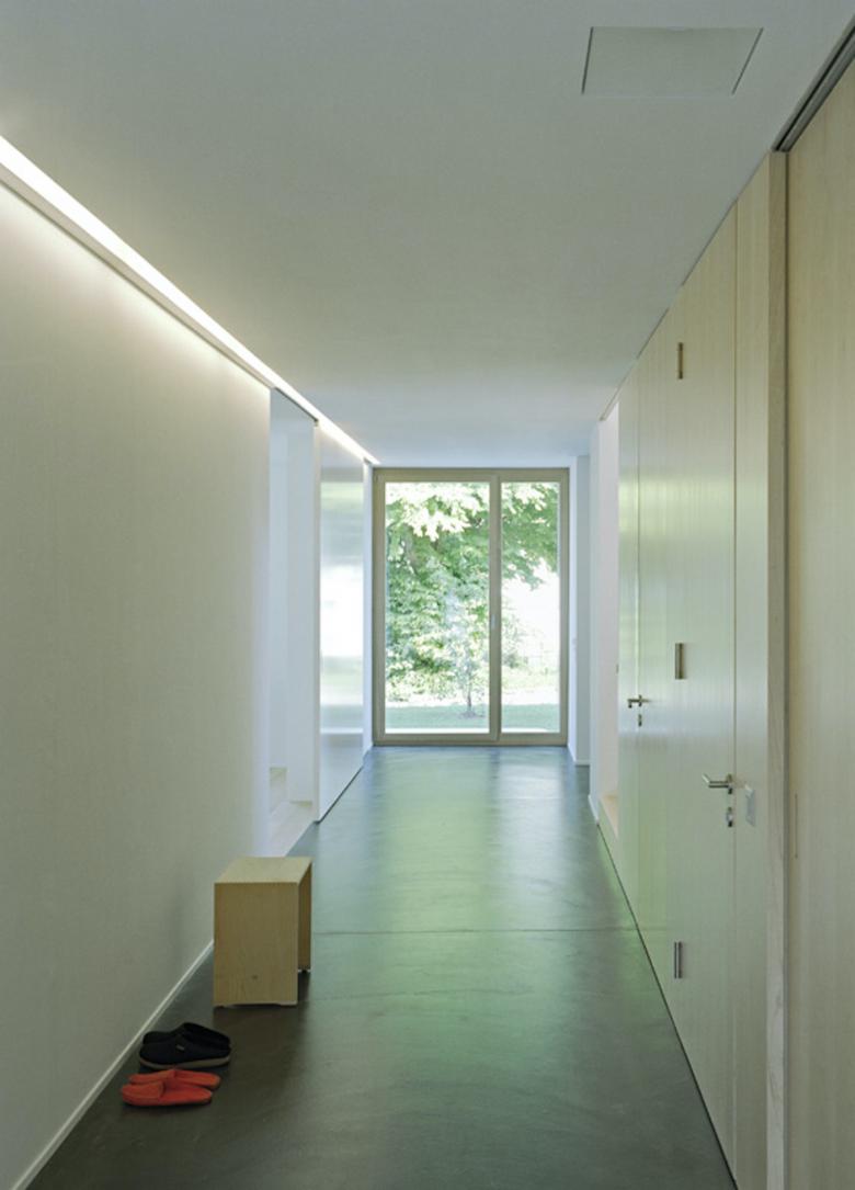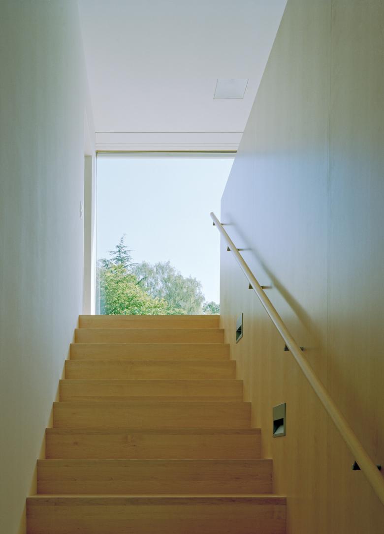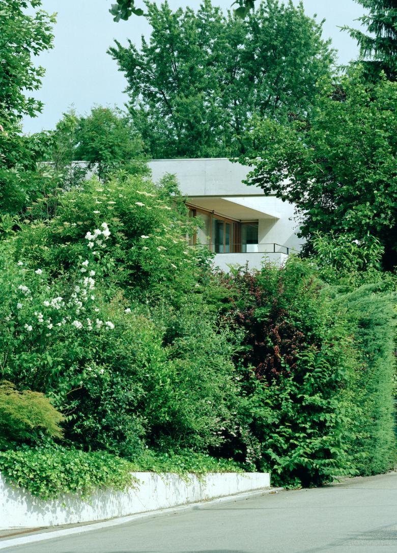Der helle Sichtbetonbau mit Holzfenstern und Holzgaragentor weist klare Linien auf. Die präzise eingesetzten Fenster rahmen die Fernsicht, den Garten und die Baumkronen so, dass man die umliegenden Häuser des Einfamilienhausquartiers nicht wahrnimmt.