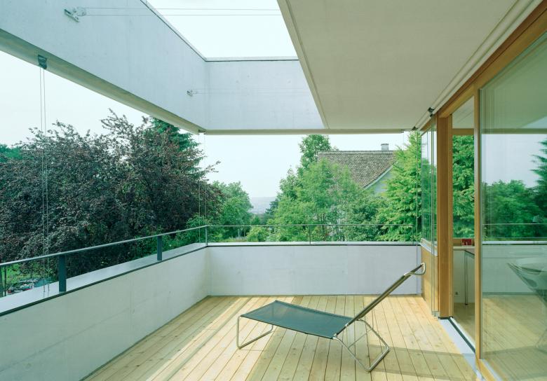 Speziell hervorzuheben ist der intime Balkon gegen Südwesten, welcher im Obergeschoss dem Elterntrakt vorgelagert ist. Von hier aus ist es möglich, eine Aussicht auf das Bergpanorama, die Stadt bis zum Primetower und den See zu geniessen.