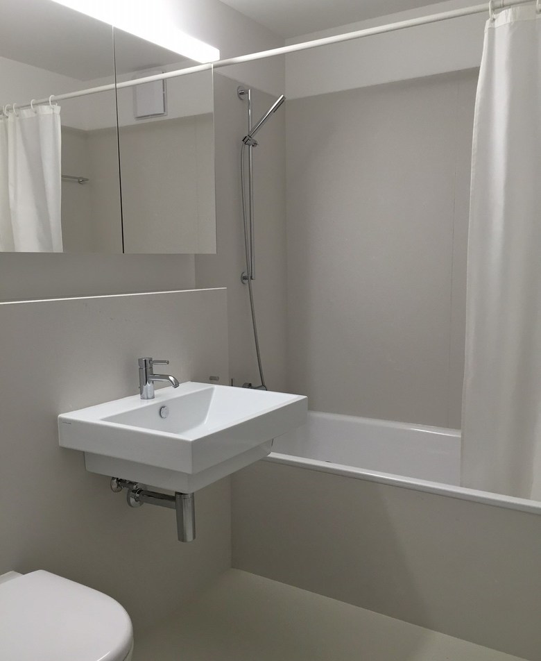 Für die Küchenabdeckung und die Wandbeläge im Bad kam ein Kunststein, welcher den gleichen Farbton aufweist wie der Kautschukbelag, zum Einsatz.