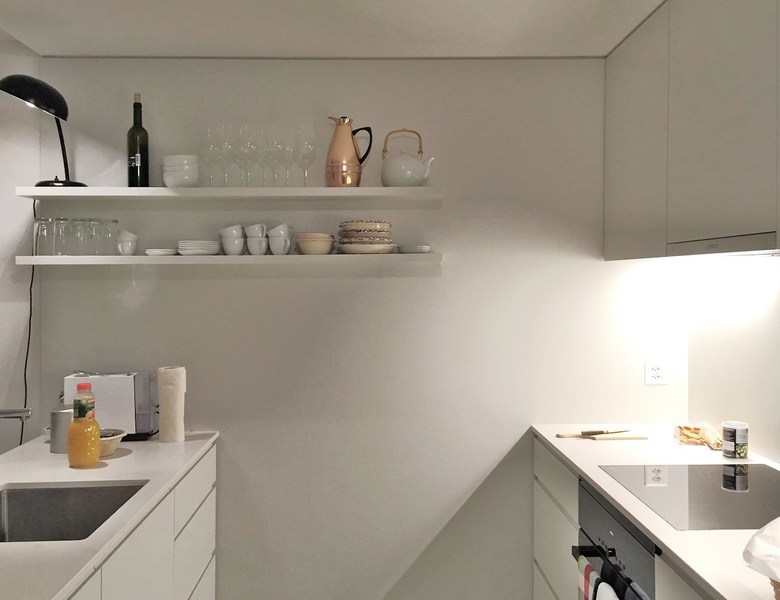 Durch das Öffnen der kleinen, fensterlosen Küche zum Wohn-/Essraum und durch die Materialwahl konnte eine helle heitere Stimmung erzeugt werden.