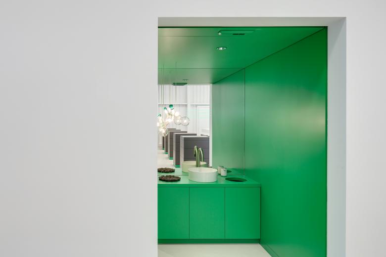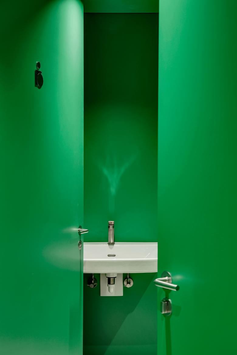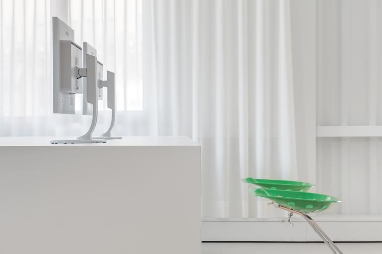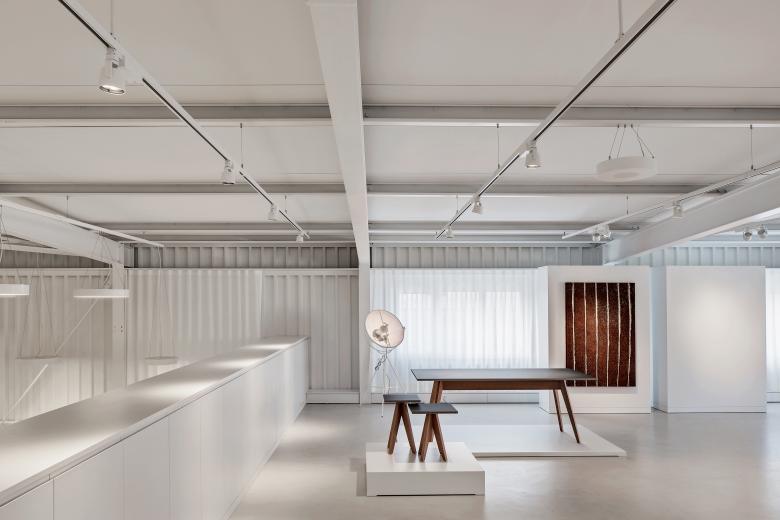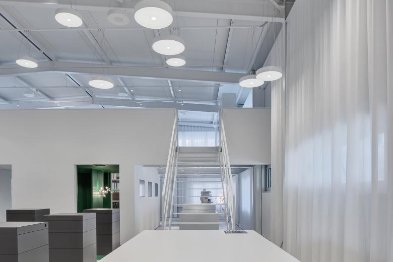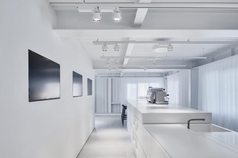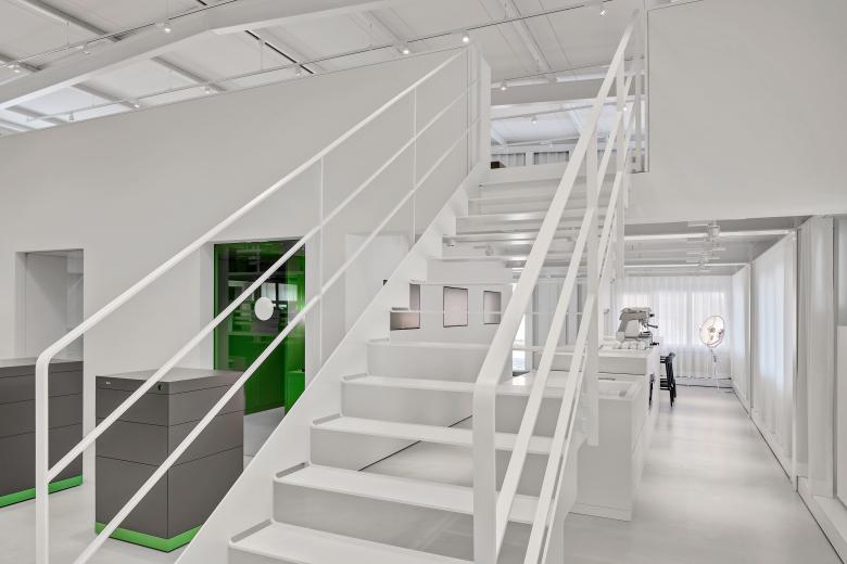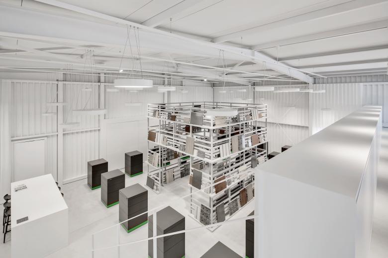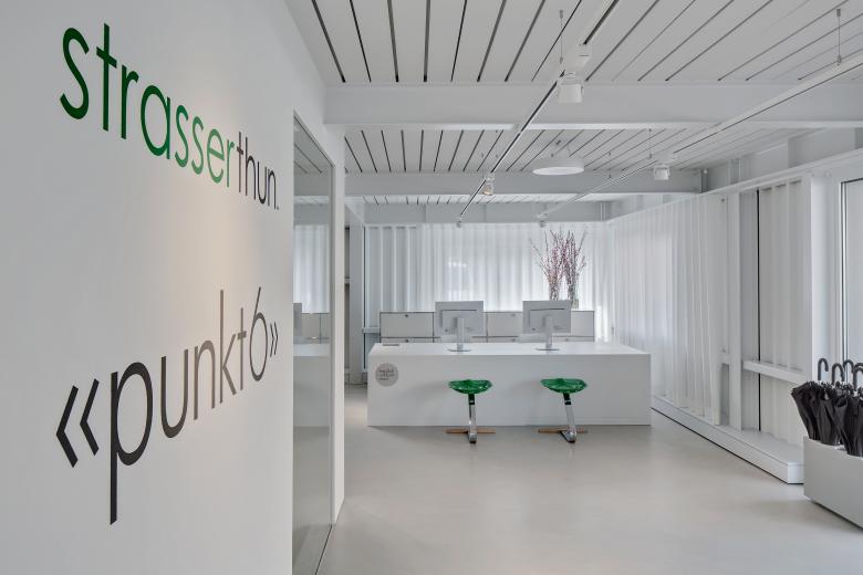 Um es auf den Punkt zu bringen, was die Strasser AG Thun Gutes tut, haben wir den Showroom Punkt 6 kreiert. Ein Stahlbau, der minimal in der Farb- und Formgebung Verbindungen offenlegt und dessen Klarheit von seiner Konstruktion und seinen Materialien bestimmt wird. Die Innenarchitektur ist in zurückhaltendem Weiss und Hellgrau gehalten, um den Materialien in Form von Halbfabrikaten genügend Ausdruck zu verleihen. Die Interpretation einer Plattenfräse-Skulptur dient dem Kunden als Projektionsfläche und soll ihn animieren, sich mit der vielfältigen Welt der Materialien auseinanderzusetzen. Im Unterschied zu einem reinen Showroom versteht sich punkt6 als inspirativer Ausgangspunkt und erlaubt grossen Spielraum bei der Weiterverarbeitung – ganz im Sinne der Kreativen. Zudem ist der Showroom bewusst gegen den Trend der Online-Thematik konzipiert und als umfangreiche, reale Materialbibliothek entwickelt worden.