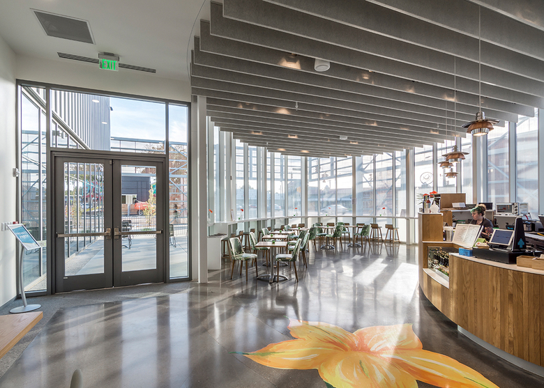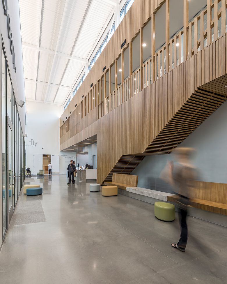 The courtyard spaces offer opportunities for the community to engage with the school, and also break the scale of the large building down to suit the context. The exterior form, composed of layers of glass, perforated copper, and volumes of contrasting metal evokes the character of a music box. Gauzy screens and courtyards that penetrate the building mass both mask and reveal the activity of dancers within. Warm and neutral materials alongside cool colors are also used to frame and display activity and the dancers.