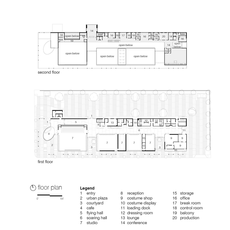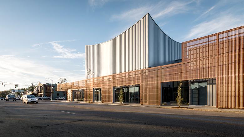 The copper screen sits at the historic street edge—enhancing the urban experience within an entertainment district—while complying with current city codes and setbacks. The building’s façade offers opportunities for the community to participate in the organization, via exterior courtyards, retail experiences, and a café, and a costume shop featuring a display window/mini-performance place.