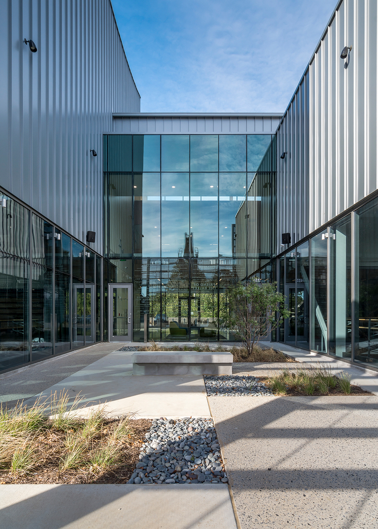 The new, civic-oriented facility is an extension of the Company’s mission. With large windows and public courtyards, the building contributes to the already thriving urban district. Formerly a hotel with parking in the front, the new site design inverts the original scheme. The building is designed to engage the public in movement, culture, and connection to the community. It houses rehearsal space for the professional company, a dance school for over 200 children, and community dance and pilates classes. The largest rehearsal studio also doubles as a performance venue.