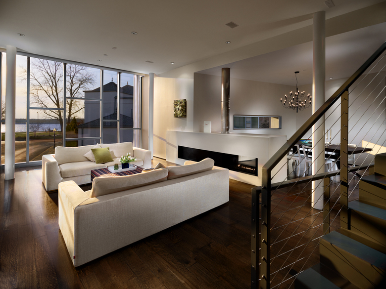 The house is a series of experiences that are directed by view and movement. The first floor has floor-to-ceiling glass that defines a combination of entry, patio and guestroom spaces. The visitor moves up and into the home’s living level, which reveals an intensely focused view of the River. Lastly, one ascends to the most private zone, the master suite. It includes a dramatic view of the River, a sweeping vista to the north, and a rare city view to the south.