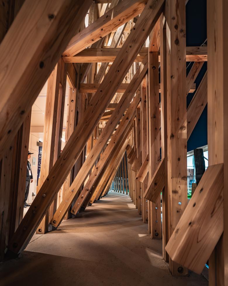 The 4th story atrium, enveloped by a mesh membrane, softly reflects and diffuses daylight and indirect light. The ceiling membrane, illuminated by high-power linear lighting installed above the top beams, delivers softened light down to the ground floor, offering visitors comfort as if embraced by the “Mother Sea” or within a mother’s womb.