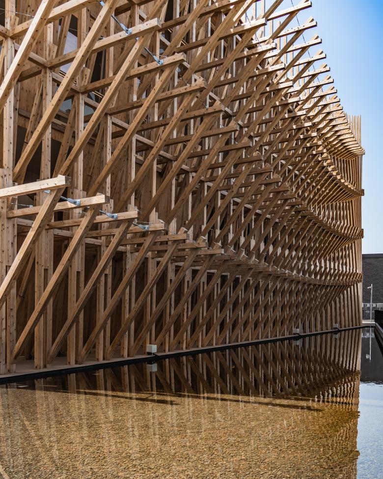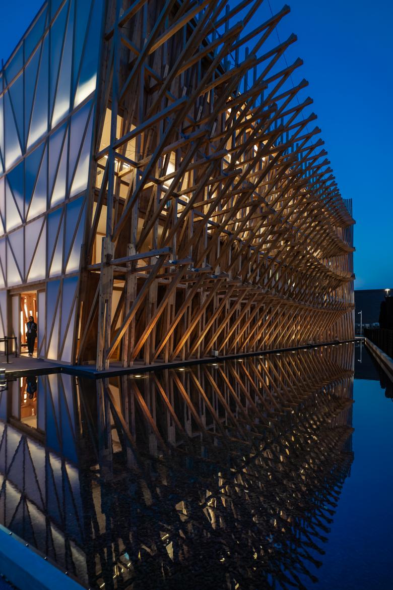 Water features on both sides of the pavilion incorporate underwater lighting, casting shimmering reflections onto the timber structure, suggesting a vessel illuminated by the “Mother Sea” embarking on a voyage.