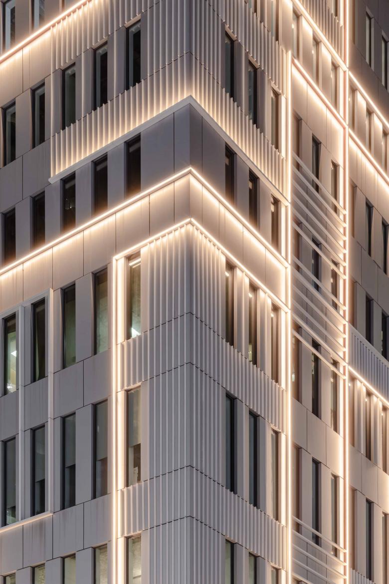 The façade light, constantly evolving over time, reflects the synthesis of East- (New York) and West- (New Jersey) side cultures rooted in this area. It also connects to the adjacent buildings through a gradient of light.