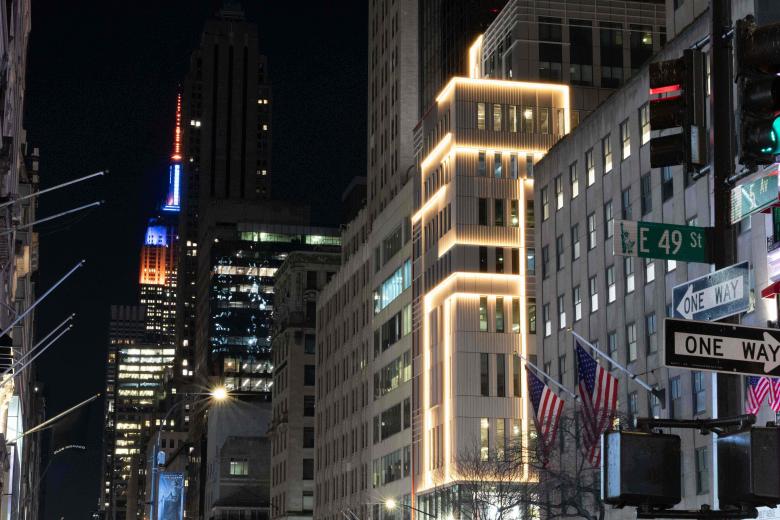 Light of the East-West fusion façade that illuminates Fifth Avenue in New York, with the Empire State Building as the background.
