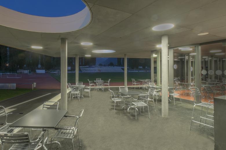 Das Referenzniveau des Gebäudes liegt erhöht zur Spielfläche. Der vorgelagerte gedeckte Erschliessungsbereich ist auch Aussentribüne.