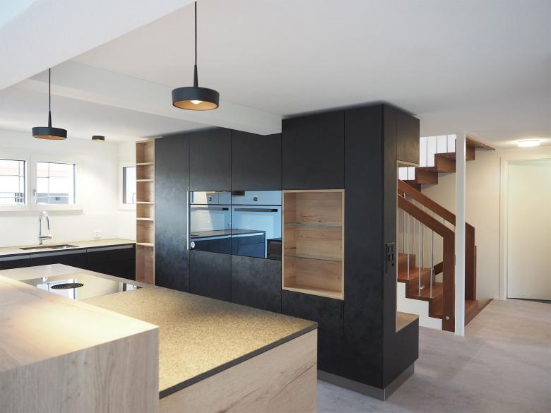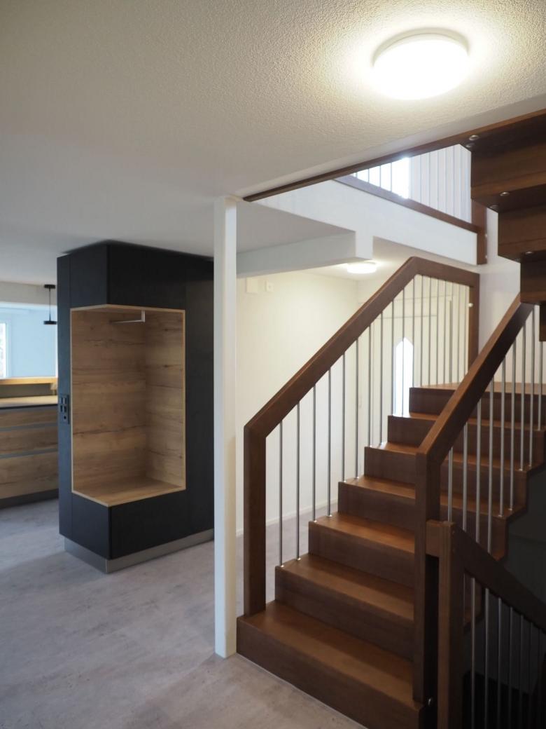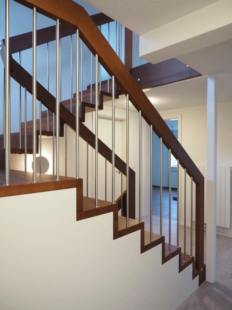 innenräumlich wird das haus mit dem umbau komplettsaniert und allgmein grosszügiger und offener gestaltet. die moderne treppe ermöglicht erstmals die durchgehende verbindung über alle geschosse. tageslicht gelangt dabei vom obergeschoss in die unteren räumlichkeiten.