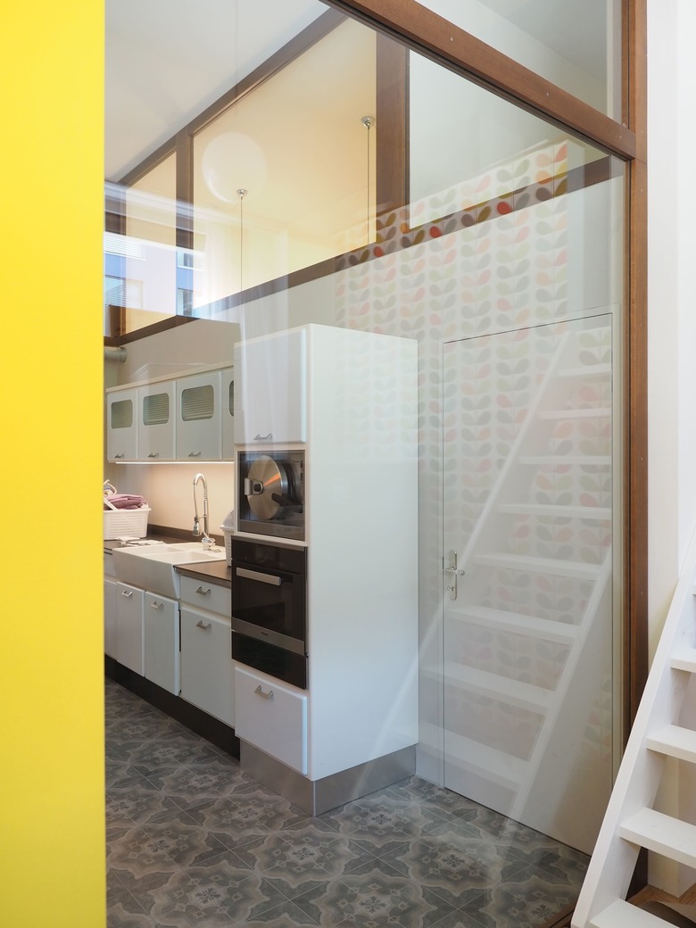 eine erdgeschossig situierte stockwerkeigentum- einheit wurde von gewerbe (bestehende arztpraxis) zu wohnzwecken umgenutzt. die räume weisen eine lichte höhe von knapp 4 metern auf, welche dem loftartigen ausbau zu grunde liegen.
