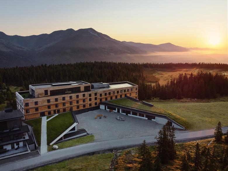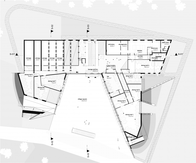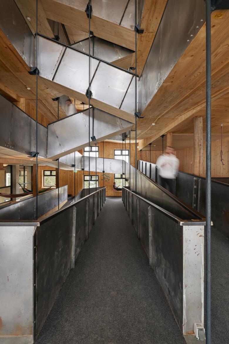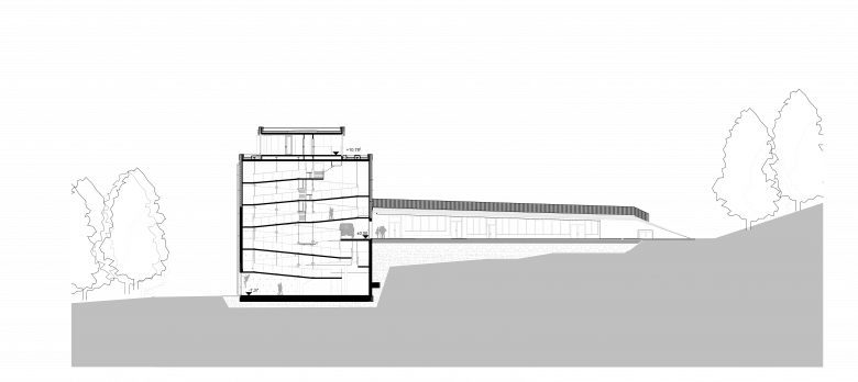 Der Zugang zum Hauptbaukörper erfolgt durch eine eingeschossige, über die gesamte Breite verglaste, Fläche vom Dorfplatz aus. Diese Fläche entspricht in ihrer Höhe den eingeschütteten Gebäudeflügeln die den Dorfplatz flankieren und lässt den Hauptbaukörper wie eine Brücke über den Dorfplatz schweben. Räumliche Komplexität entsteht bei der Annäherung an den Baukörper. Während man im Verlauf des Dorfplatzes tief in die Landschaft eindringt, ergeben sich immer mehr Blickbeziehungen durch den Hauptbaukörper hindurch in die vom Niveau niedrigere Landschaft auf der anderen Seite. Dies geschieht durch zahlreiche Lufträume zwischen den Geschossen die dem schlichten Baukörper bei räumlich näherer Betrachtung eine visuelle Durchlässigkeit verleihen. Das Erdgeschoß auf der Ebene des Dorfplatzes beinhaltet das Foyer, von dem aus die Geschoße mit Rampen erschlossen sind. Diese Erschließung ist mittig über die gesamte Breite des Längsbaukörpers positioniert und streckt den Raum des Foyers durch das Luftloch in der Mitte der Rampen in die Vertikale. Die Vertikale der Rampenerschließung und die zahlreichen Lufträume zwischen den Geschossen entwickeln eine räumliche Symbiose und ermöglichen reichhaltige Querblicke zu einer dreigeschossigen Kletterwand, die im UG 2 beginnt und bis ins 1.OG reicht, zu einer Sporthalle im zweiten UG, sowie zu zahlreichen weiteren Freizeitaktivitäten, wie Trampoline und Schnitzelgruben. Durch die zentrale Positionierung der Haupterschließung definiert diese die innere Typologie des Baukörpers in einen West und Ost Trakt, in denen jeweils eine eigene Fluchttreppe am Gebäudeende situiert ist. Am oberen und unteren Ende wechselt die Erschließung von Rampen auf Treppen, um die vertikale Erschließung weiter auszudifferenzieren. Beide Gebäudetrakte sind halbgeschossig zueinander versetzt und nehmen so die Topografie der Landschaft auf. Ein Personenlift verbindet alle Geschoße .