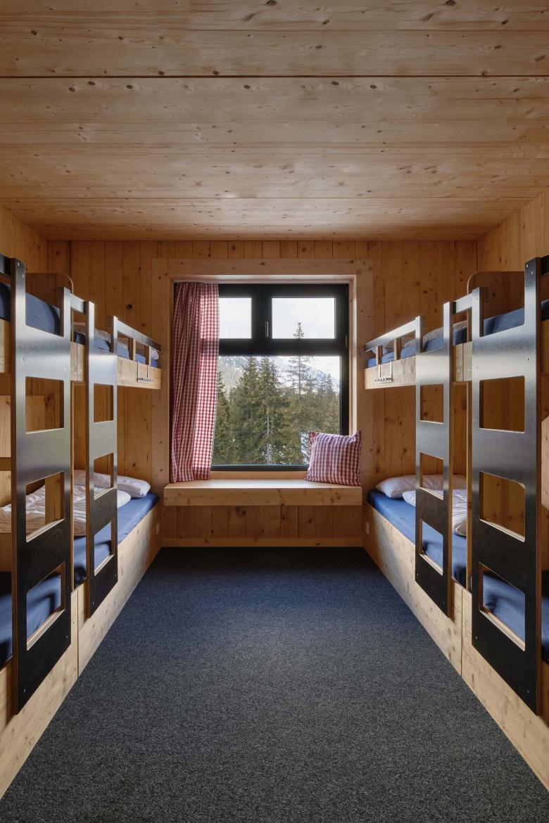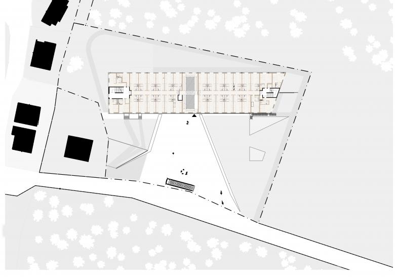 Der am Hang gelegene Bauplatz wird über die Hochkrimml Strasse erschlossen. Der Hauptbaukörper des Jugendgästehauses ist als Längsbaukörper in Holzbauweise konzipiert, dieser ist im nördlichen Bereich des Areals positioniert. Die städtebauliche und räumliche Intention ist es, zwischen dem Hauptbaukörper und der Straße einen südausgerichteten U- förmigen „Dorfplatz“ entstehen zu lassen, der als vermittelnde halböffentliche Zone zwischen dem Jugendgästehaus und der umgebenden Bebauung fungiert. Dieser Platz wird von zwei zum Platz ebenerdigen Seitenflügel begleitet, die Richtung Ost und West als Landschaftswelle räumlich differenziert ausformuliert sind und den Platz als Geländeeinschnitt in der Landschaft versinken lassen. In der konkreten dreidimensionalen Konsequenz bedeutet dies, dass diese zwei den Dorfplatz begleitenden Gebäudeteile in die Landschaft eingeschüttet und anschließend begrünt werden. Sie verschmelzen mit der Umgebung. Nähert man sich dem Jugendgästehaus an, so tritt es als schlichter Holzbaukörper in Erscheinung.