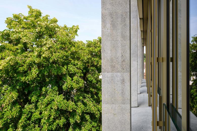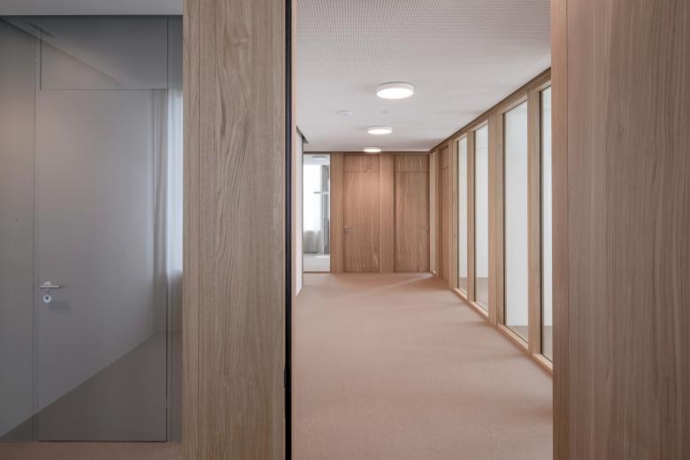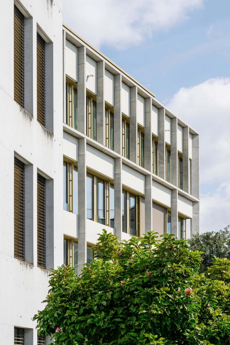 Auf den zwei in Massivbau erstellten Untergeschossen bildet der Kern, die Flachdecken mit den Skelettstützten und dem leicht konstruierten Attikageschoss die Grundlage für die vorgesetzte und schmuckhafte Fassade in Naturstein und vorfabrizierten Betonelementen. Die Historie wird durch den lokal abgebauten und in der Stadt als Baumaterial heimischen Muschelkalk in der Fassade aufgenommen und wiedergegeben. Textile, halbtransparente Sonnenschutzmarkisen und der grosse Glasanteil lassen das Haus allzeit in Interaktion mit der Stadt treten. Zur Ermöglichung dieses Austauschs funktioniert das Haus mit Bauteilkühlung, gespiesen durch die optimalen Grundwasserbedingungen des Ortes. Das Erdgeschoss ist Teil des urbanen Stadtraumes. Mit Stadtbäumen und der Pflästerung aus Gneis entlang der Bahnhofstrasse, wie auch dem sekundär orientierten Vorgarten, werden der Öffentlichkeit Raum und Möglichkeiten angeboten wie auch den Ansprüchen des Stadtgrüns Rechnung getragen.