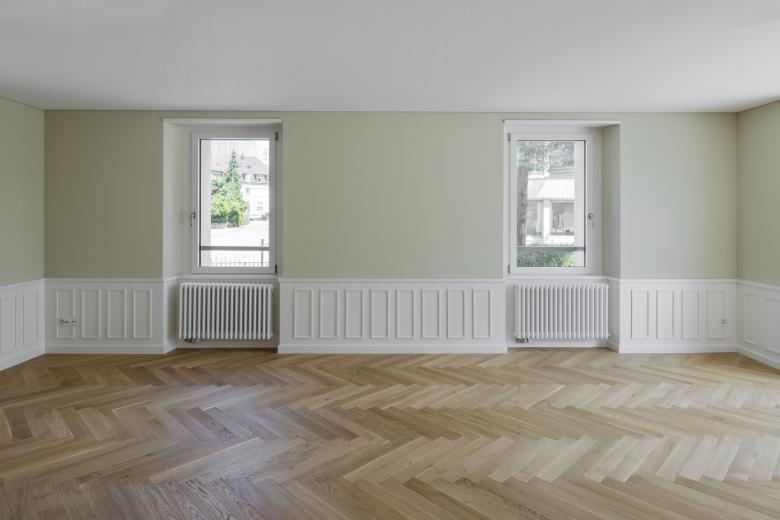 Die grösste Anpassung im Innenraum erfolgte bei der Eingangssituation. Diese führte früher von der Stapferstrasse durch den Garten hindurch und man gelangte durch eine kleine aussenliegende Treppe direkt in das innenliegende Treppenhaus. Eine Garderobe, oder der Platz dafür, war nicht vorhanden. Mit dem Erstellen des Carports, von der Seidenstrasse her erschlossen, bot sich die Gelegenheit, auch die Eingangssituation zu verbessern. Neu erfolgt der Zugang von der Westseite her. Über die neue Garderobe erreicht man das neu organisierte Wohngeschoss. Die Trennwand zwischen Essen und Wohnen wurde entfernt sowie das Fenster zum Garten hin vergrössert und bis zum Boden verlängert. Das neu erstellte Brüstungstäfer, die farbliche Absetzung der Wände und der hochwertige Fischgrat-Eichenparkett werten das Wohn- und Esszimmer zusätzlich auf. Die Grundrissdisposition im Obergeschoss wurde unverändert übernommen. Im Dachgeschoss wurden die Balken sichtbar belassen und gereinigt. Das nun voll ausgebaute Dachgeschoss mit zwei Lukarnen bietet Platz für ein grosszügiges Zimmer sowie ein neu erstelltes Badezimmer. Das vorhandene Hochparterre des Wohnhauses bot die Möglichkeit, ein zusätzliches hochwertiges Zimmer mit ausreichend natürlicher Belichtung im Untergeschoss zu erstellen.