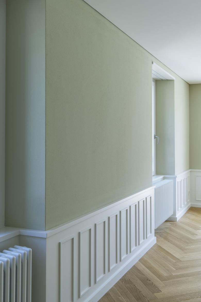 Sämtliche Oberflächen wurden ersetzt und sorgfältig ausgewählt. In den Wohn- und Schlafräumen kommt ein hochwertiger Eichenparkett zum Einsatz. Im Eingangsbereich und den Nassräumen wurden als Kontrast zur Eiche schwarze Bodenplatten und moosfarbige Wandplatten ausgewählt.