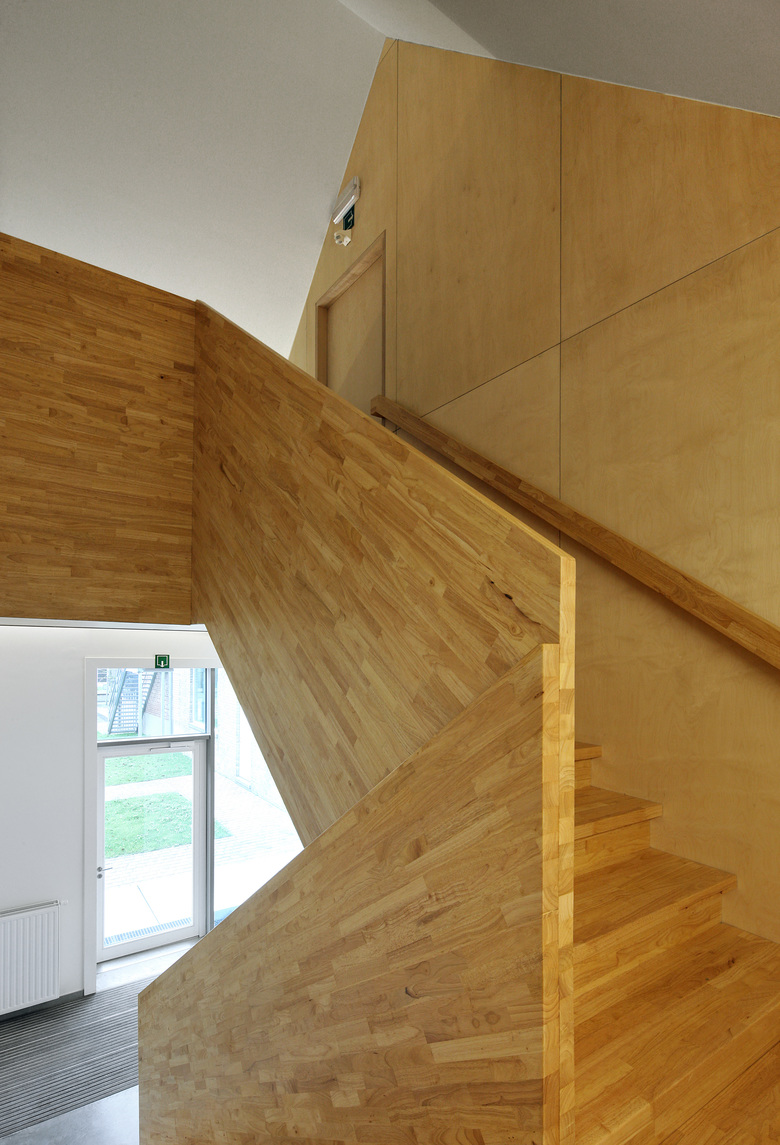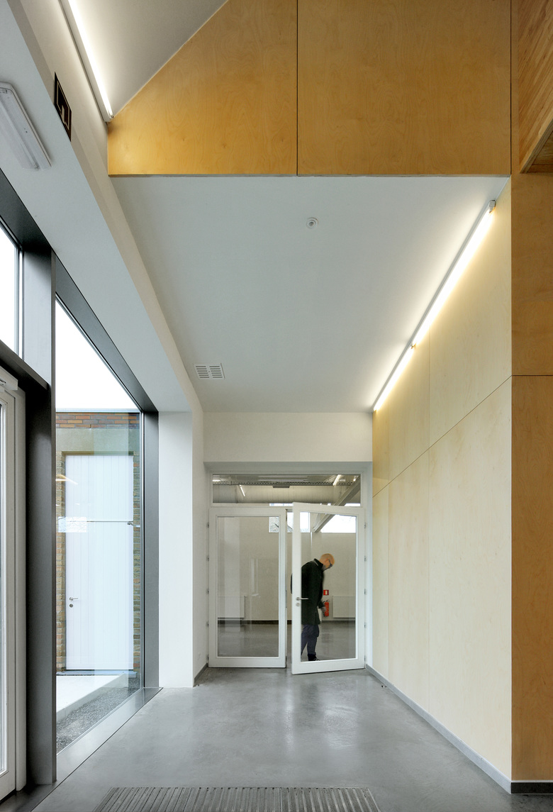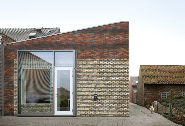 In Westvleteren the existing complex of buildings consisted of multiple successive structures, ranging from a 19th century school building and an old town hall, to an industrial structure from the 1990s. The dilapidated storage building made way for an enlargement of the meeting hall. And so the back yard became an outdoor space for the party room. The gabled roof was replaced by a single sloped roof, thus making the room and space higher, and creating better acoustics in the main hall. A central entrance hall connected the different functions and spaces and accentuated the entrance of the building. By using different types of bricks we emphasised the successive renovations in the past. The new added walls built from contemporary bricks, strengthened the patchwork of these different bricks. Thus, the community centre was adapted to the modern requirements, while respecting the environment and the users, and adding a whimsical character.