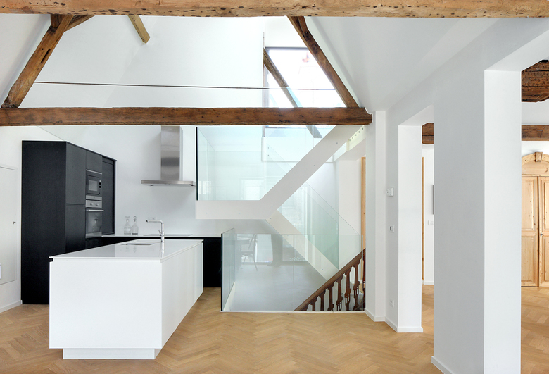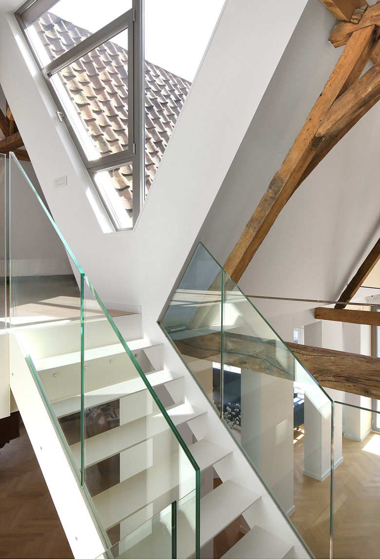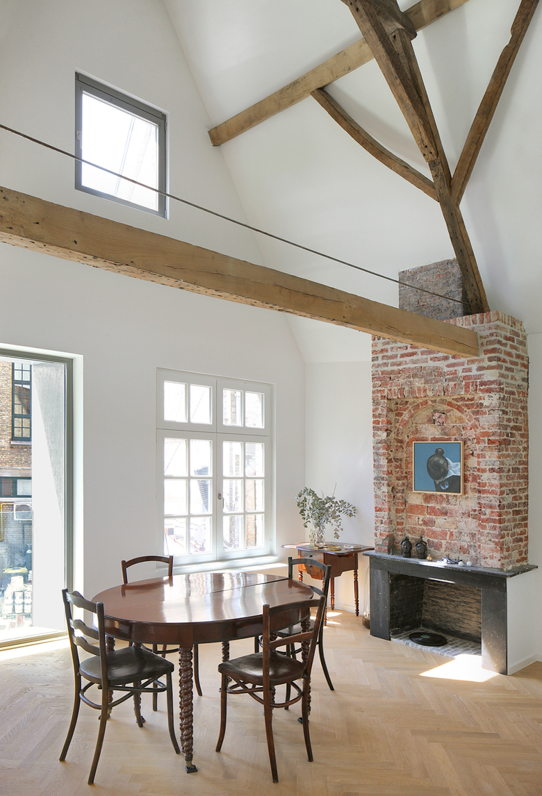 Two disused 17th-century houses on a protected brewery site in the centre of Bruges were rebuilt into a family home (with retail and storage space). The structure was opened up to connect all the spaces on both floors of both houses.