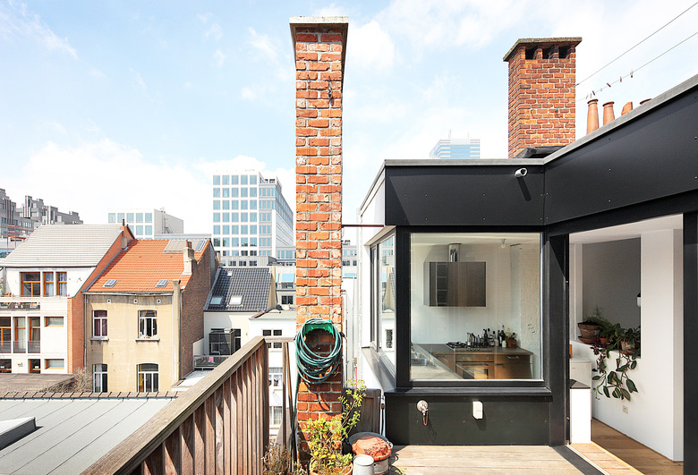 This duplex apartment is on the third and fourth floor of an apartment building in the centre of Brussels. Several separate small rooms on the fourth floor were converted into a large living space. The dilapidated ceiling at the back was taken out, making the apartment very spacious. Large windows along the rear façade fold around the patio and bring the urban landscape into the heart of the home. The many ducts and chimneys of the underlying apartments are not concealed. On the contrary, they are a crucial part of the interior, together with the exotic plant collection of the resident. The existing brick wall is kept visible. The use of different types of brick displays the many historical layers of the building. Roof lights emphasize the verticality of the ducts and chimneys and the spaciousness of the apartment. This creates an interplay of light and shadows throughout the day.