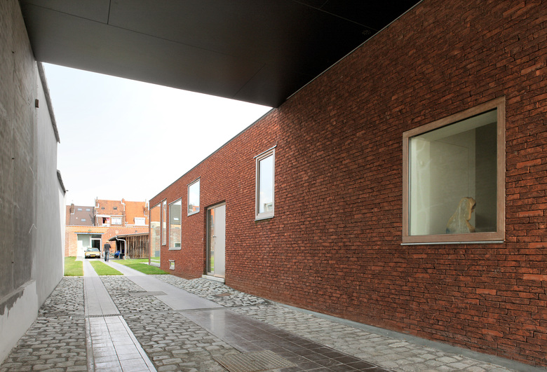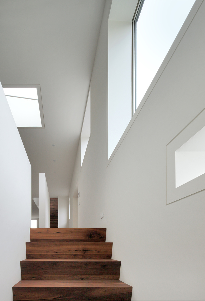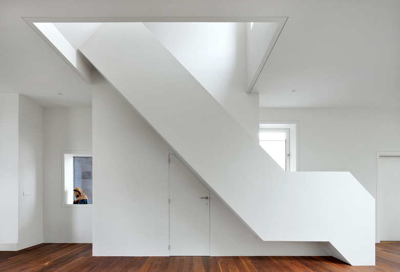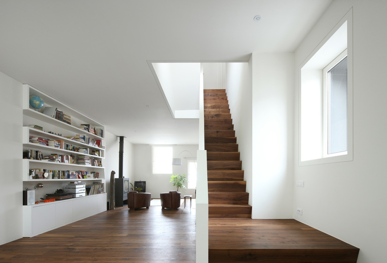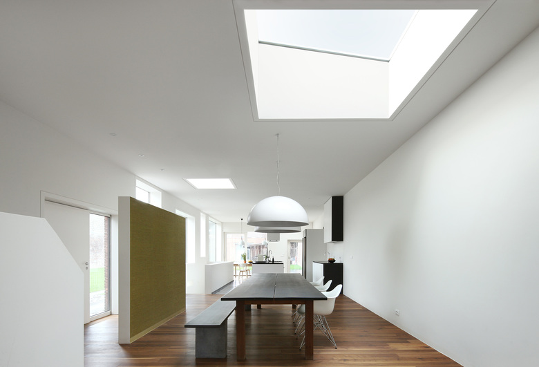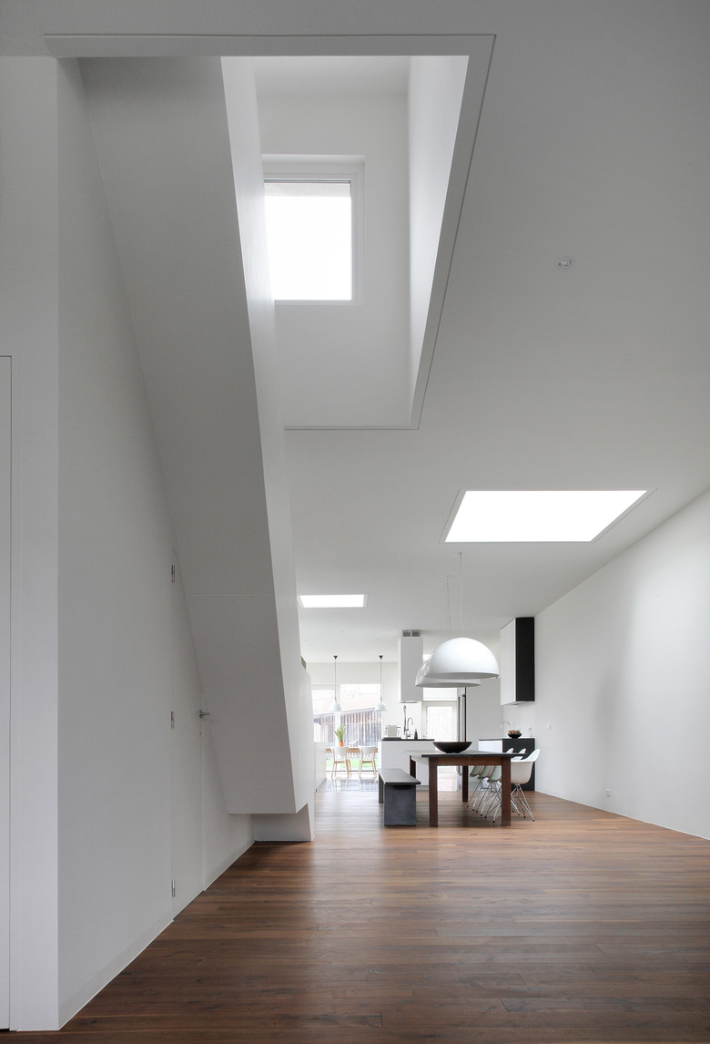 The rear structure of the terraced house was in poor condition. We replaced the structure with a new beam-shaped residential volume. A well-chosen composition of wooden windows and skylights provide the dwelling with light, sun and views. An underground storage enables us to create an open space which contains the living, cooking and dining activities. Furniture pieces subtly structure the layout of the residential volume. The strict rhythm of the windows on the upper floors in the front façade is continued on the ground floor. The shift of one window refers to the composition of windows in the new rear construction.