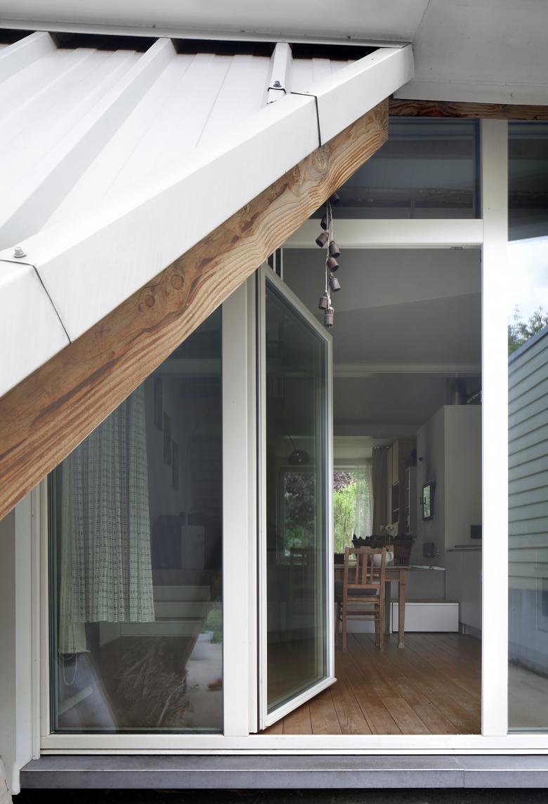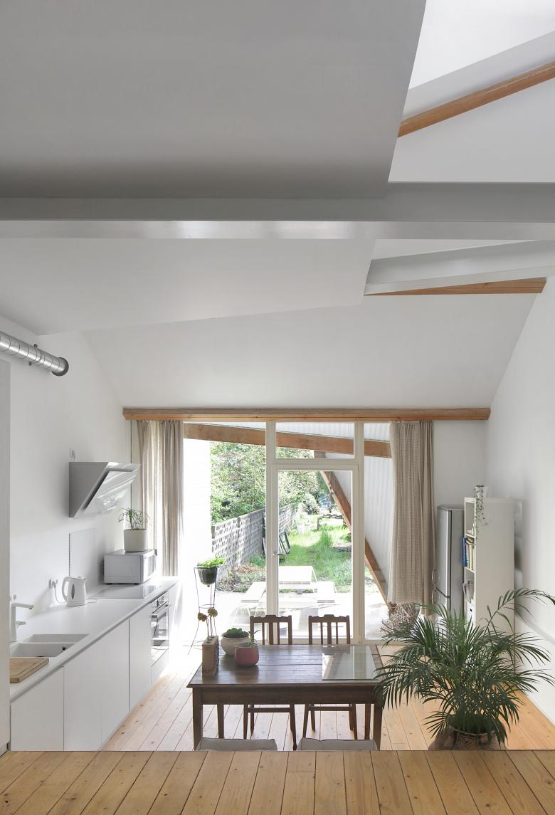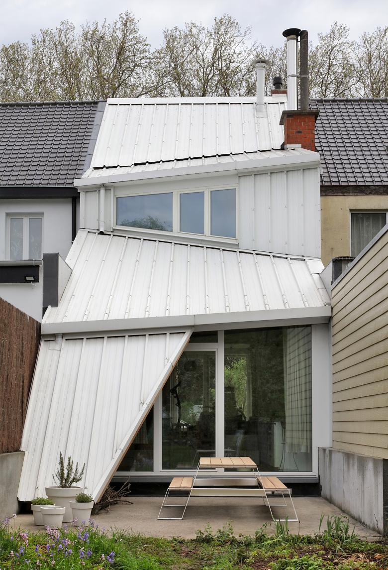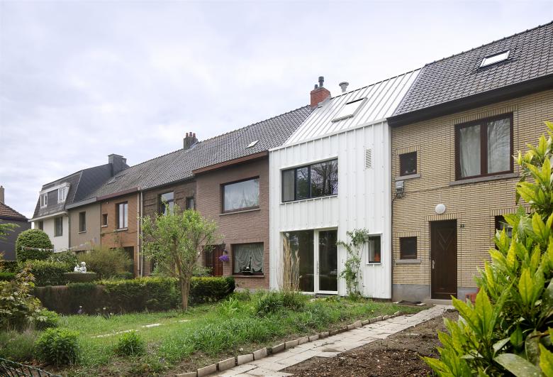 The front and rear façade and pitched roof are cladded in white metal sandwich panels. This creates a unity in volume and makes the house highly insulated. The design both integrates in its context and stimulates the surrounding urban fabric. The large windows at the rear and front of the ground floor are a welcoming gesture to use the multifunctional space as a meeting spot.