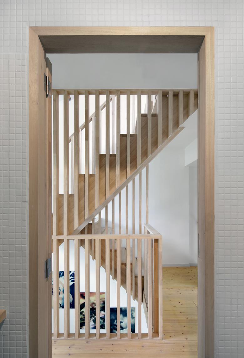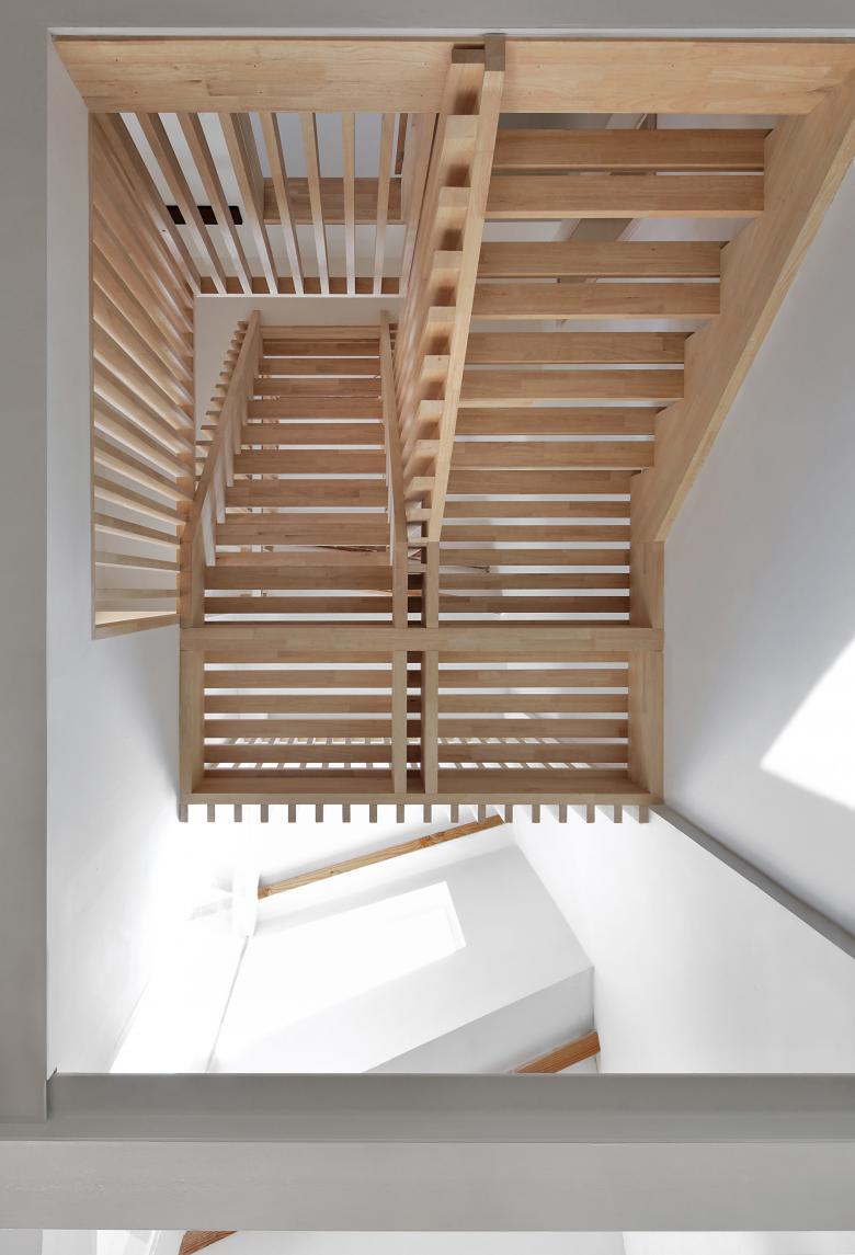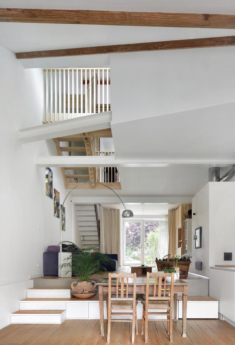 The site has a significant slope; the rear garden is approximately 95cm below the level of the front yard. The level difference is integrated in the home. The ground floor is lowered 70cm at the back, thus creating a physical relation with the garden. Simultaneously the ground floor becomes more spacious. A new wooden stair with an adjacent vide brings light in the heart of house.