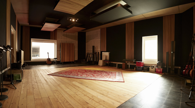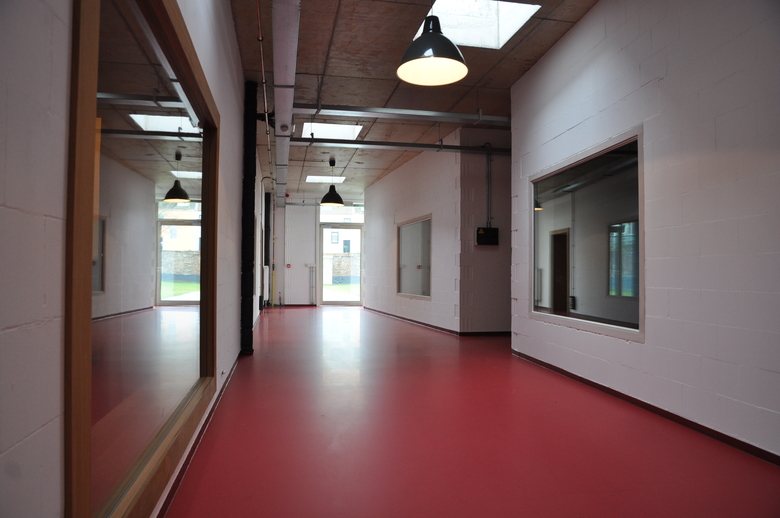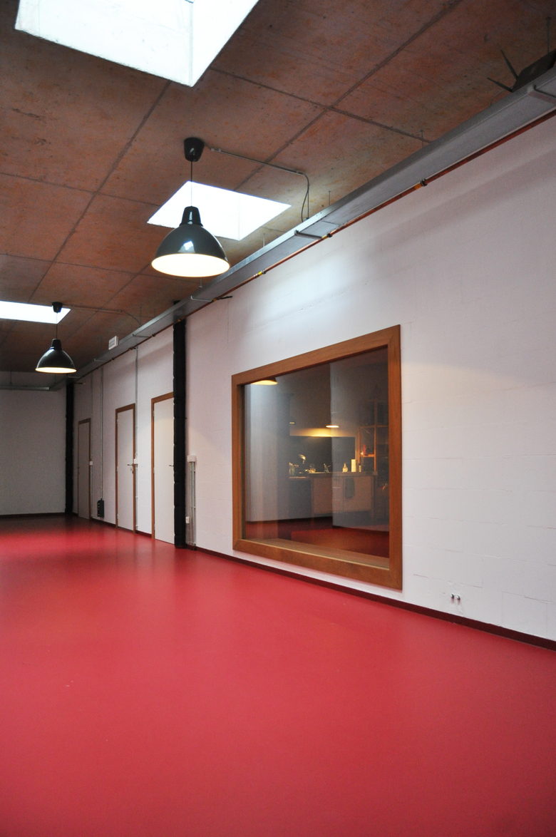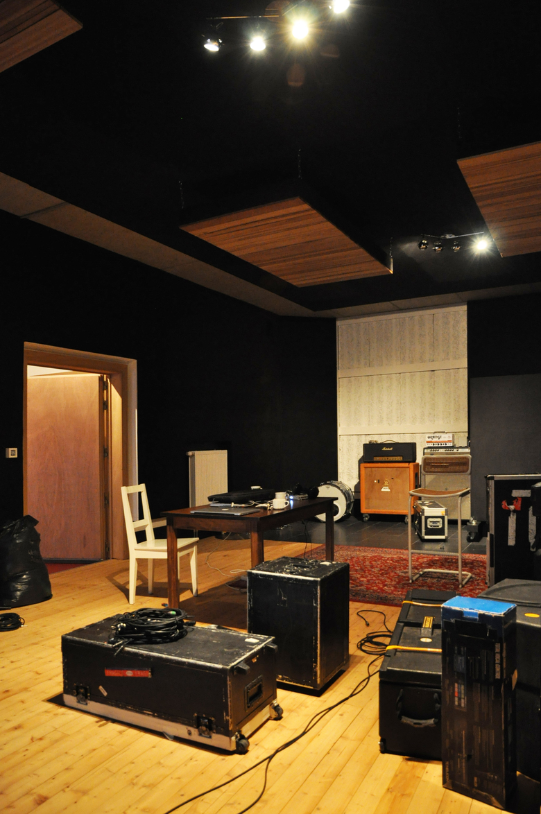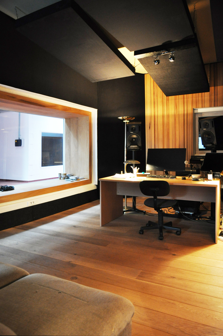 A former carpenters’ shed, centrally located within a block of houses, is converted into a private recording studio (Number Nine Studios), including a control room, a space for theatre rehearsals and spaces for supporting functions. Music is used as a metaphor to structure  the shed and the adjacent garden. A meandering wall, originated from the functioning of an equalizer, forms a continuous movement from inside to outside. The wall organizes the different functions. The challenge was to house music studios for rock bands between the existing houses. This challenge resulted in an interesting interplay between acoustic requirements and architectural solutions. A box-in-box principle guarantees sound insulation. Strategically placed roof lights above the central room bring light in the shed. The different spaces are focused on this lighted area.