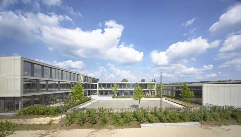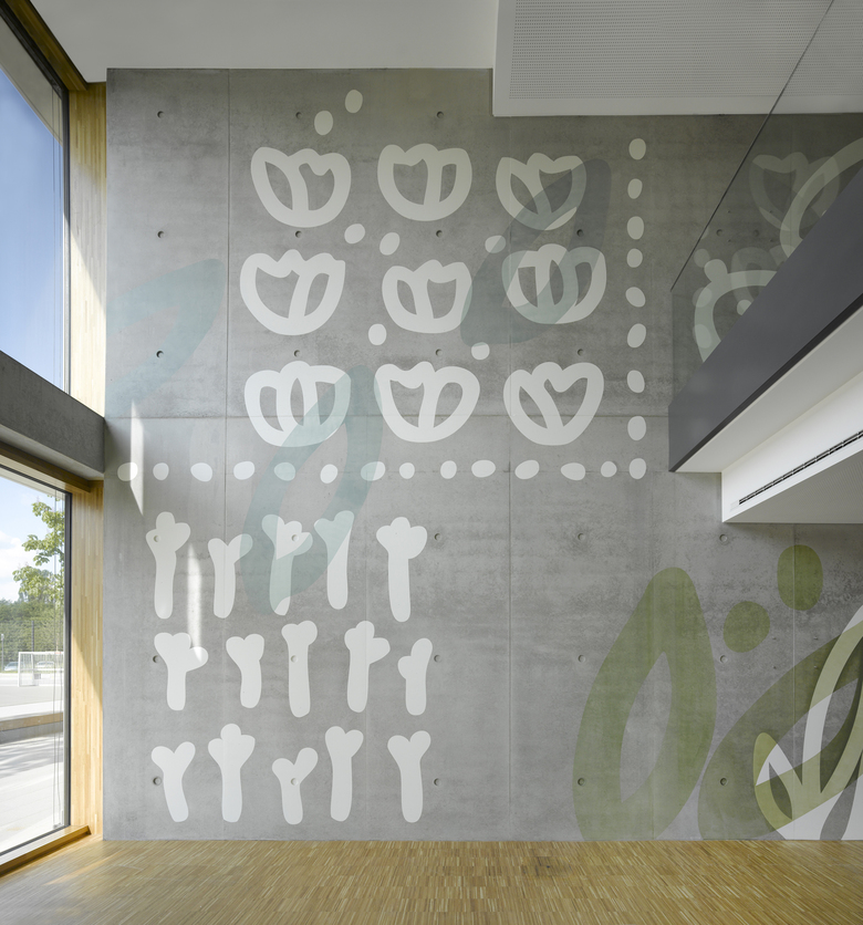 Die einzelnen Baukörper sind entsprechend ihrer unterschiedlichen Funktion auch differenziert ausgebildet. Auf diese Weise erhält die relativ große Baumasse eine Maßstäblichkeit, die den Kindern Orientierung gibt. Große Glasflächen im Wechsel mit geschlossenen Fassadenteilen aus Betonwerkstein rhythmisieren die Gebäudeteile und fassen den Schul- und Sportbereich gestalterisch zusammen.