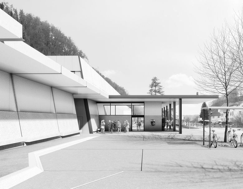 Die Grundgliederung des Projekts besteht in der linearen Anordnung aller betrieblichen Einrichtungen in einem langen Baukörper. Das Volumen bildet dabei die Rückwand für eine Sequenz von öffentlichen Räumen entlang der Hauptstrasse. Auf diese Art wird eine klare Trennung zwischen dem Personen- und dem Zugverkehr der Unterhaltsanlage möglich.